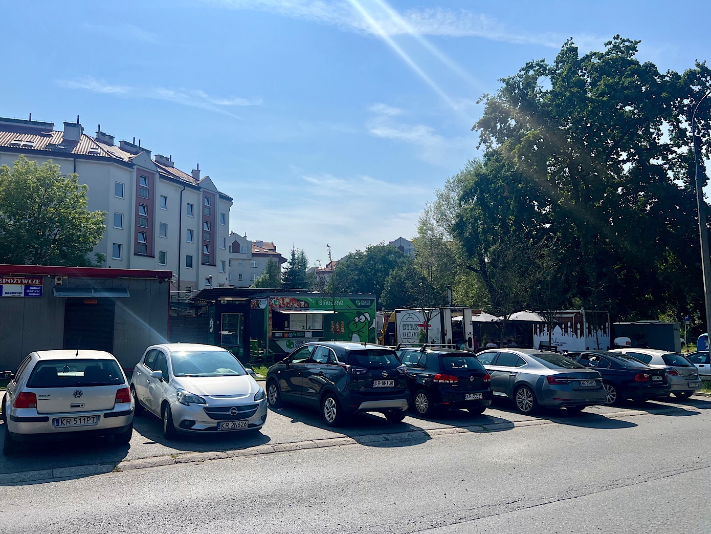 Kilka trucków zaparkowanych w lini prostej tuż przy budynku Nowohuckiego Centrum Kultury. Do dyspozycji gości miejsca przy stolikach oraz ławki. Zdecydowanym plusem jest bliskość Łąk Nowohuckich, a minusem brak toalet.