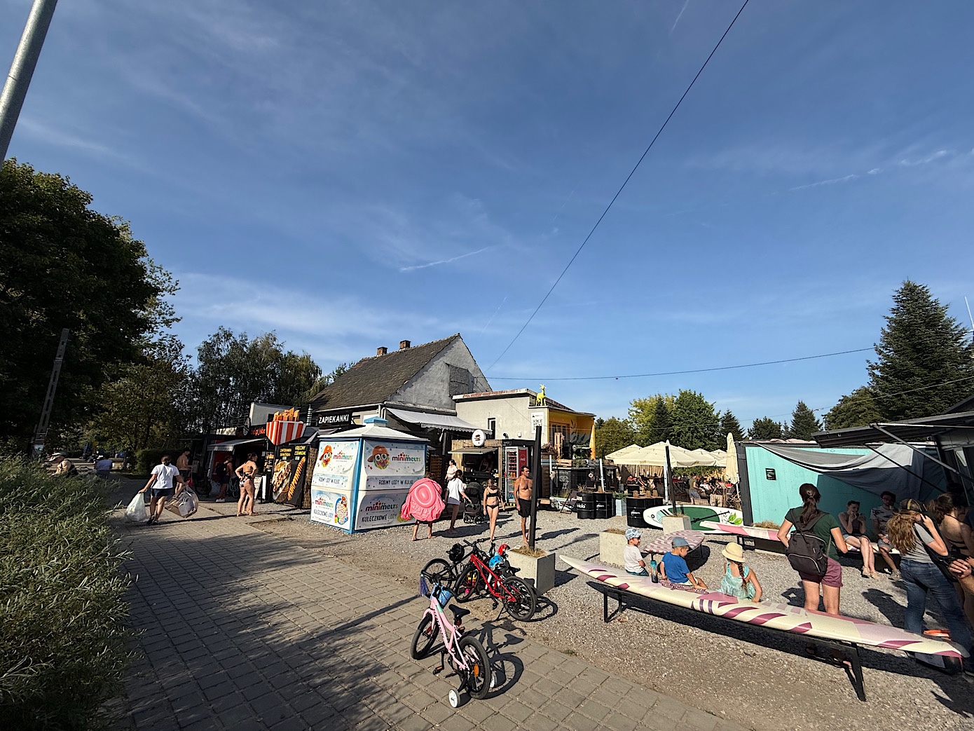 Skwer z wieloma truckami przy samym Zalewie Nowohuckim. Konsumpcja na leżakach pod chmurką.