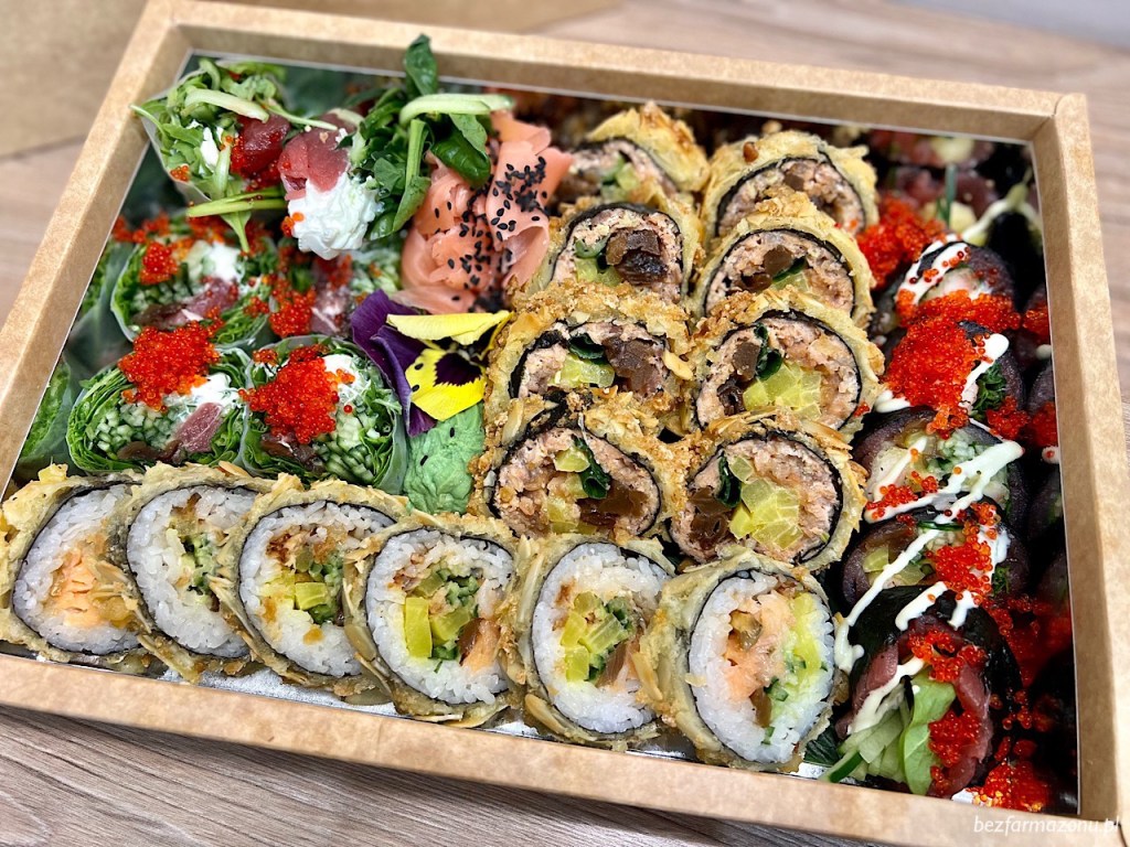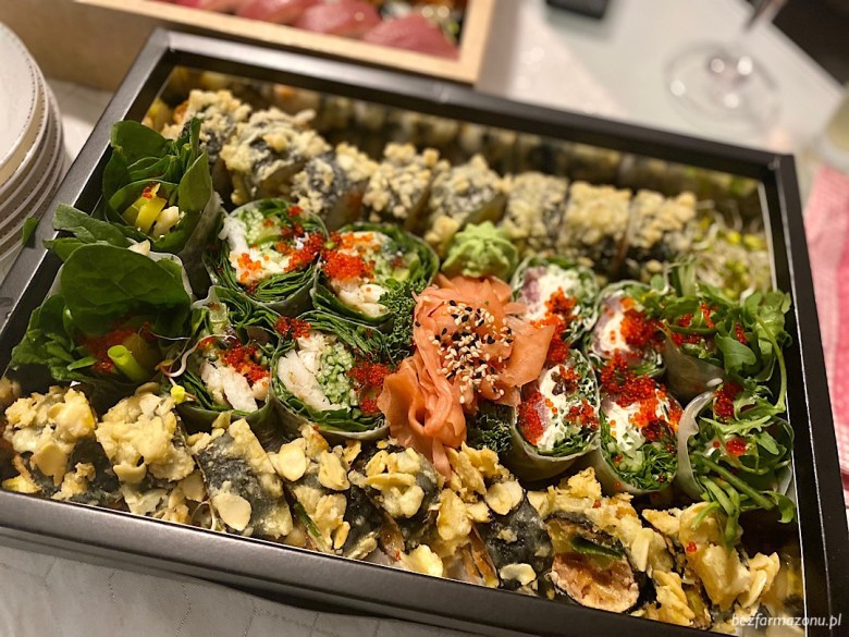 Rolki standardowe: wiosenny tuńczyk (35 PLN) i łosoś z migdałami (27 PLN) oraz w wersji keto – bez ryżu (każda za trzy dyszki). Kawały są spore, a ryż bardzo smaczny i o odpowiednim octowo – słodkim balansie. Treści i kleistości również nie można im zarzucić.
