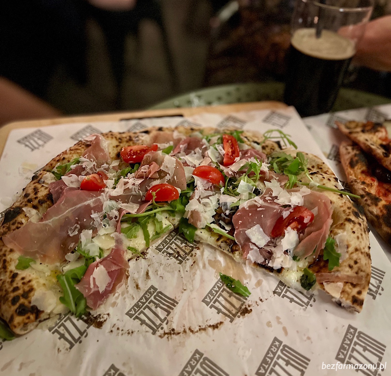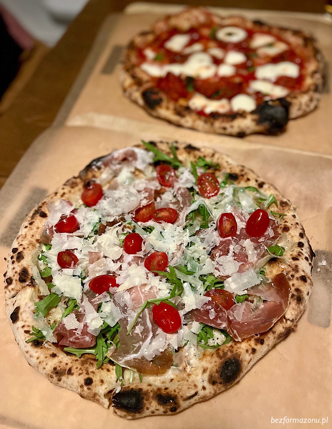 Parma (42 PLN) z prosciutto, rukolą, pomidorkami oraz parmezanem;