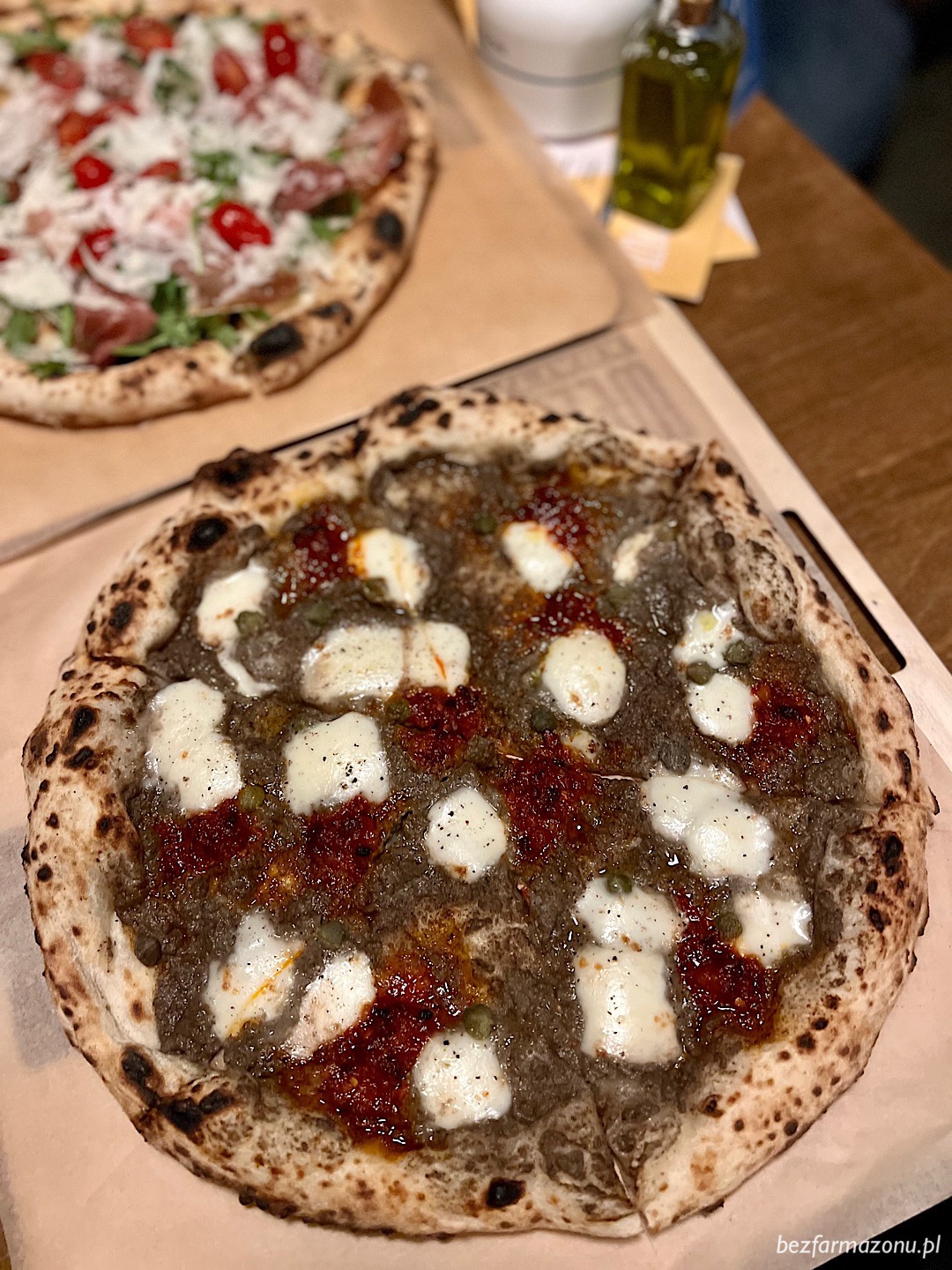 Tartufo (39 PLN) z truflową pastą, wędzoną fior d’Agerola, ndują, kaparami i pieprzem;