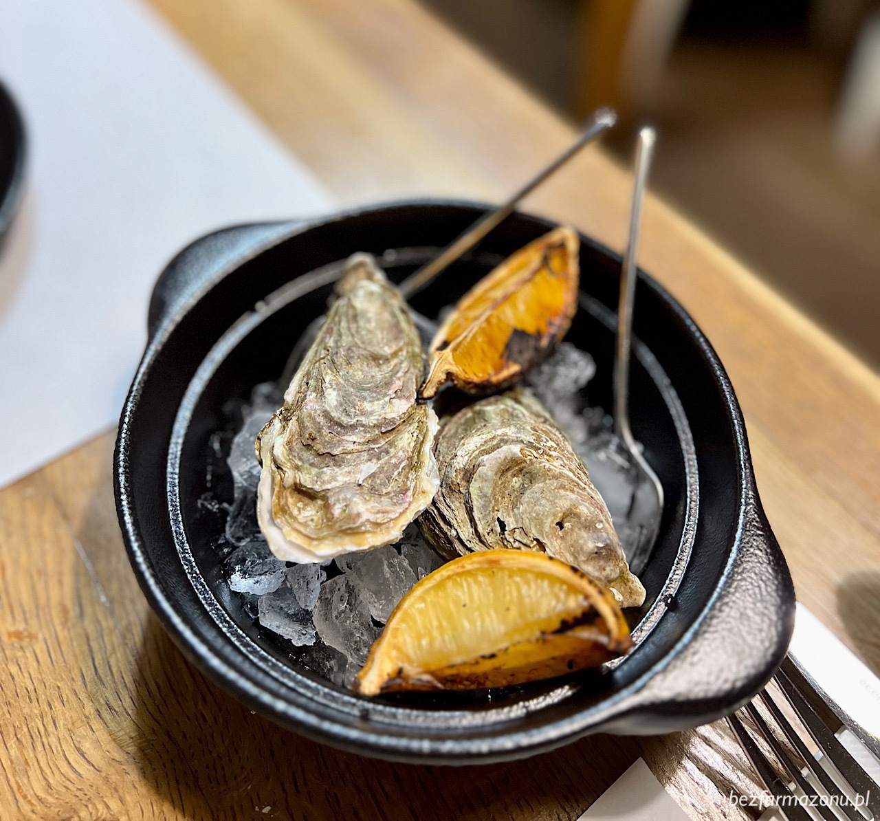 Ucztowanie rozpoczęliśmy od świeżych ostryg. Podane na lodzie w żeliwnym naczyniu, bez żadnych dodatków tylko i wyłącznie z grillowaną cytryną. Jako, że nie jestem wielkim fanem tych uznawanych za afrodyzjak nitkoskrzelnych małż, przyznaję bez bicia iż wciągnąłem je chybcikiem i popiłem Colą zero.