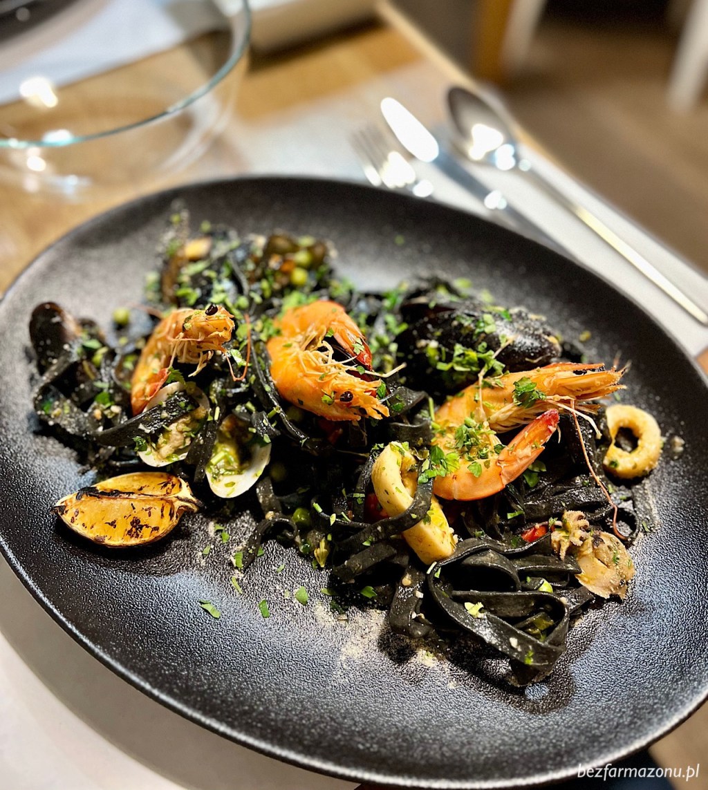 Najlepsze miało się jednak dopiero pojawić. Po kilkunastu minutach, super uprzejma kelnerka podała tagliatelle „Sottomarina„ (66 PLN) czyli barwiony sepią idealnie ugotowany makaron z przedstawicielami wód.