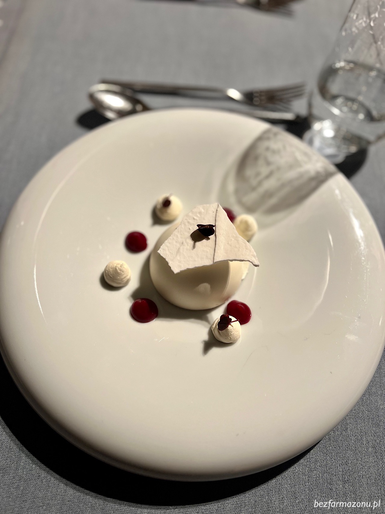 Na zdjęciu poniżej widzicie skorupkę którą wykonano z białej czekolady, jednak wiało od niej nudą – nie była wcale słodka. Gdzieś tam miały też się znajdować orzechy macadamia – nie było jednak po nich ani śladu. Słodkość nakręcała beza, ale neutralny śmietanowy krem oraz malinowy żel mówiły tej słodkości stop. Po rozbiciu skorupki ukazały się porzeczkowe lody.