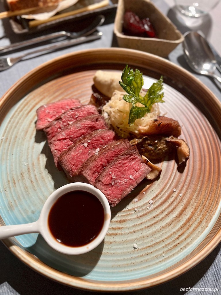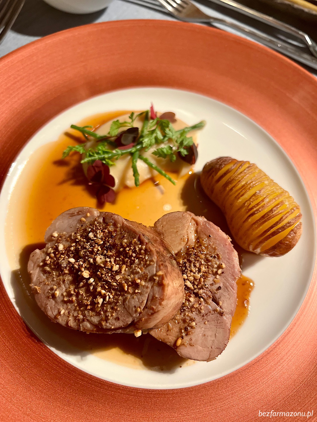 Posypana magiczną mieszanką podobno japońskich przypraw, ultralekka i soczysta jagnięcina (konkretnie biodrówka) z delikatnym kremem z białej rzepy z przodującym w smaku jabłkiem spoczywała tuż obok pieczonego ziemniaka. Danie zestawiono z marynowanymi, pokrojonymi w kostkę buraczkami. Czysty obłęd.