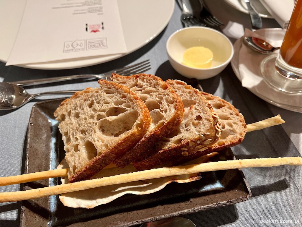 Chwilę po zajęciu miejsc przy najlepiej z całej sali oświetlonym stoliku (ogólnie panuje tam specyficzny półmrok) oraz odebraniu naszych ubrań, uprzejmy kelner podał przepyszny i świeży wypiekany na miejscu chleb wraz z rzemieślniczym masłem oraz paluszkami grissini.