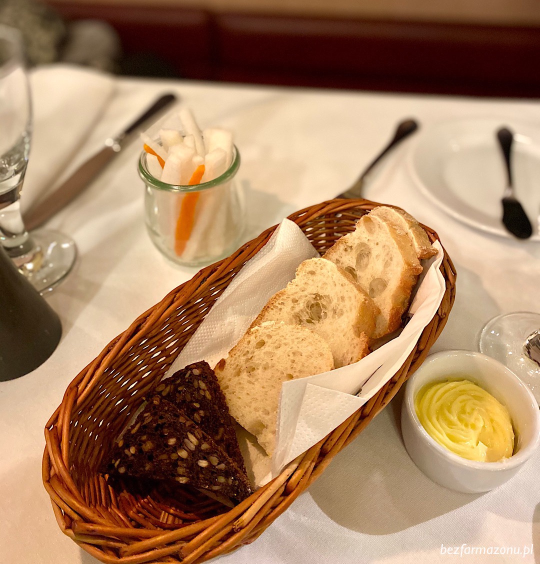 Zamówiliśmy po przystawce i daniu głównym, a przed ucztą dostaliśmy czekadełko w formie domowych chlebów z solonym masłem oraz słoiczek z idealnymi do chrupania białą rzodkiewką oraz marchewką. Miły ukłon w stronę bezglutenowców.