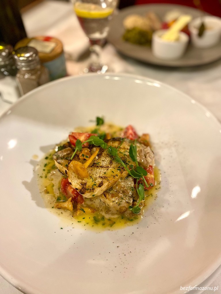 Nie mogłem odpuścić wdzięczącym się w sezonowej wkładce grillowanym grzankom kąpiącym się w śmietanowo – maślano – kurkowym sosie z pomidorkami koktajlowymi (około 30 PLN).