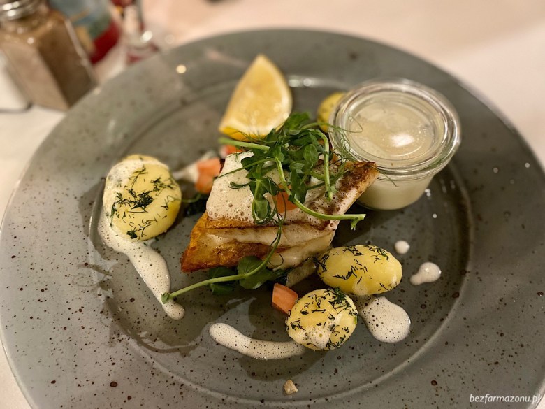 Filet z sandacza (66 PLN) na szpinaku i grzybach z młodymi gotowanymi ziemniaczkami oraz sosem z białego wina lekki i przygotowany w sam raz na granicy soczystości i przysmażenia. Zero zastrzeżeń co do smaku, lecz jeśli chodzi o porcję, to dwa takie 40 gramowe filety plus odrobina kartofelków i szpinaku, faceta by na pewno nie posiliły.
