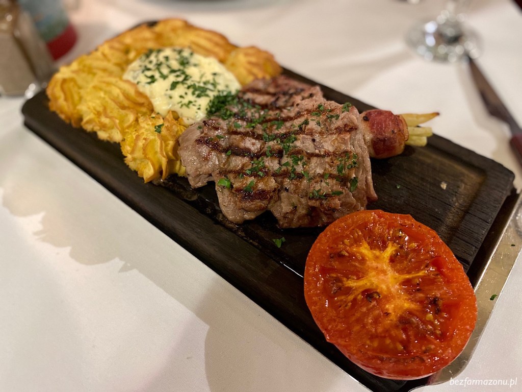 Planksteak (78 PLN) to tradycyjne danie kuchni szwedzkiej (steak on a plank w prostym tłumaczeniu oznacza stek z deski).