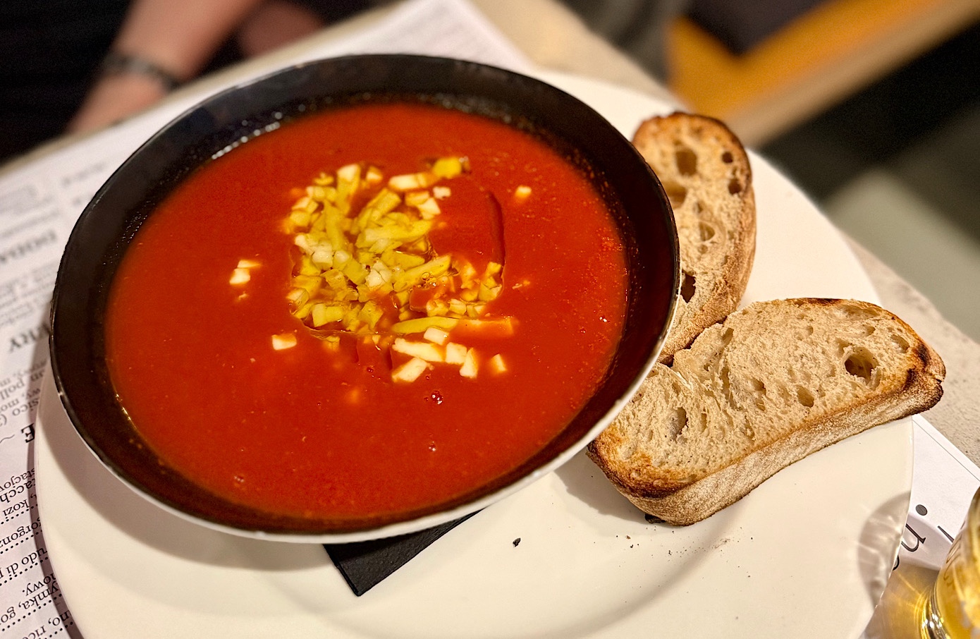 W grudniu 2025 wpadliśmy na późną kolację. Skusiliśmy się na krem z pomidorów (28 PLN) oraz sałatkę Cezar (42 PLN).
