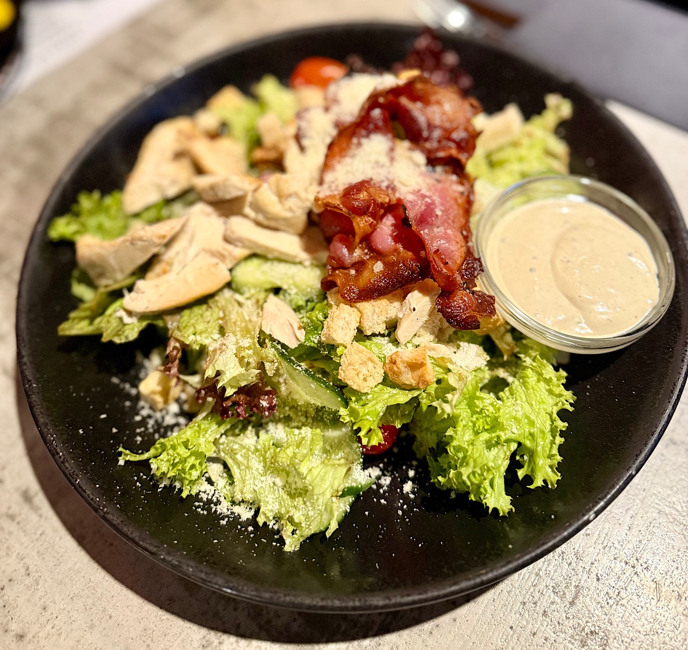 Krem całkiem spoko, ale sałatka słaba. Po pierwsze kurczak który do niej trafił był już zleżały (nie przyrządzony przed podaniem), podobnie sprawa się miała z boczkiem. Sos zawierał bardzo dużo pieprzu, ale miło, że na prośbę podano go w oddzielnym pojemniku.