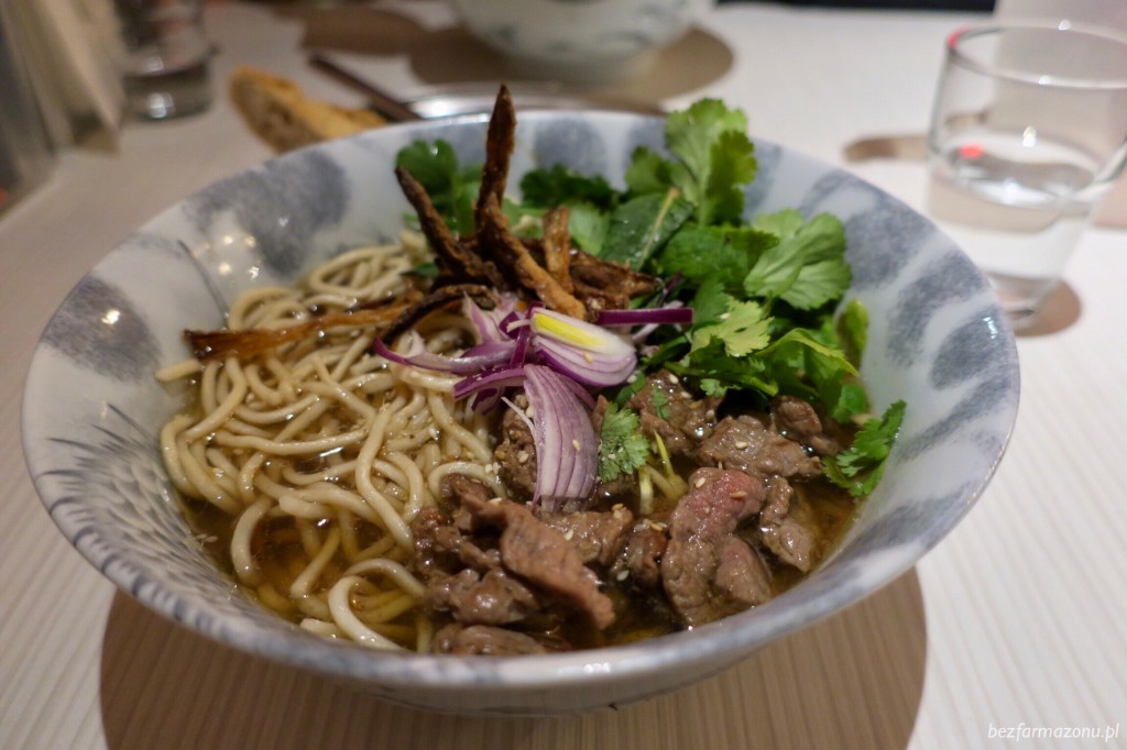 • zupa na wywarze drobiowym z wyśmienitym, sprężystym makaronem jajecznym, ziołami, czerwoną cebulą i smażoną wieprzowiną (25 PLN) całkowicie skradła moje serce. Mówię Wam, a raczej piszę – ten bulion to istna aromatyczna bomba. Rakieta, torpeda, no nie wiem jak mogę go określić innymi niż niecenzuralne słowami. To definitywnie jeden z najlepszych bulionów jakie jadłem w życiu! Ale żeby znowu tak bardzo nie kolorować, K. nie miała o nim aż tak pozytywnego zdania, co kolejny raz pokazało jak różnie skonfigurowane są ludzkie kubki smakowe.