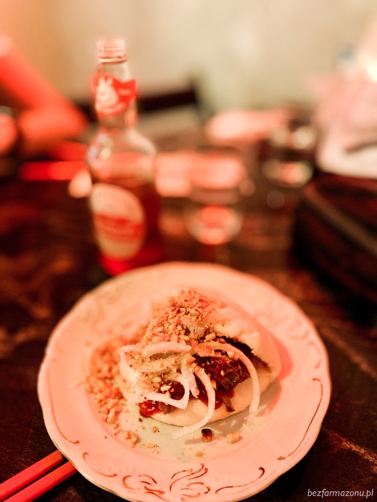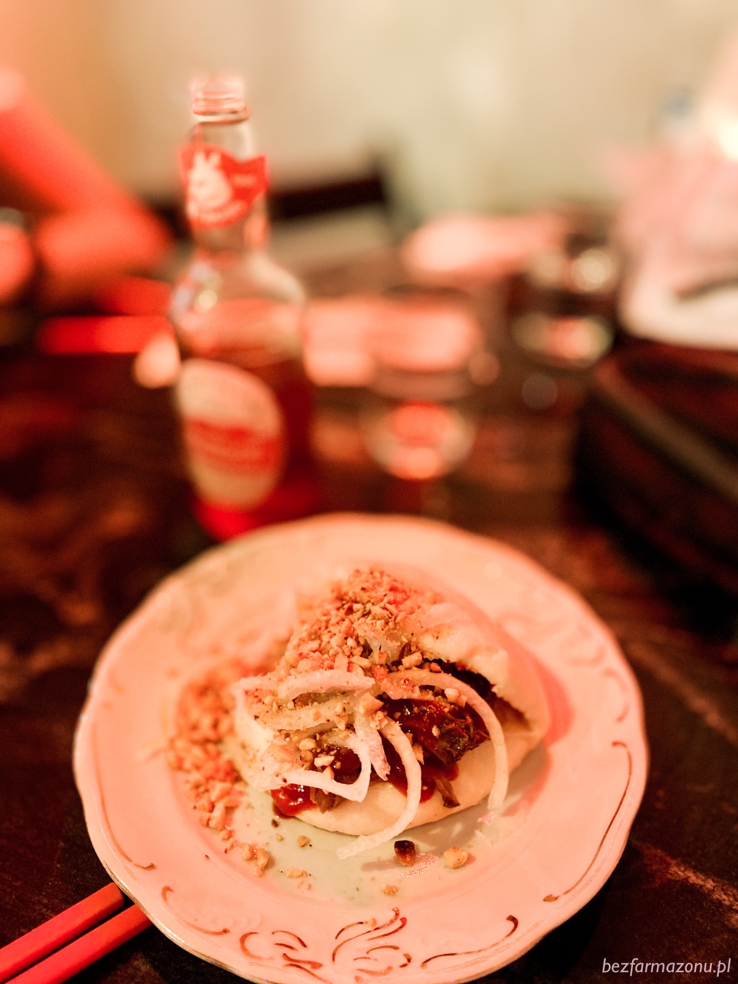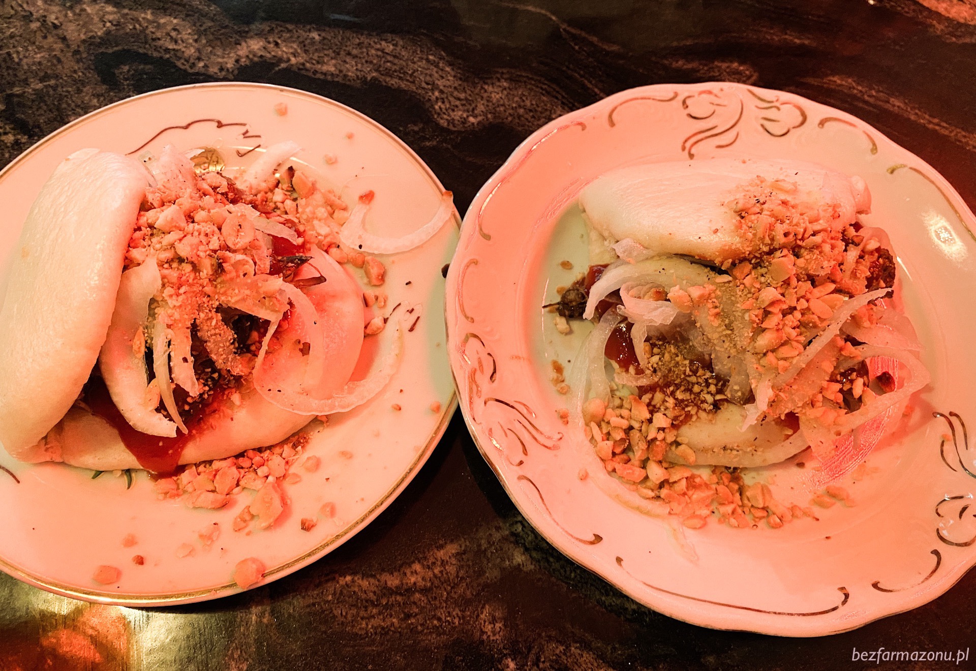 • dwie bułeczki Bao z żeberkiem wieprzowym z cebulą, orzeszkami i ostrym jak diabli sosem (25 PLN)