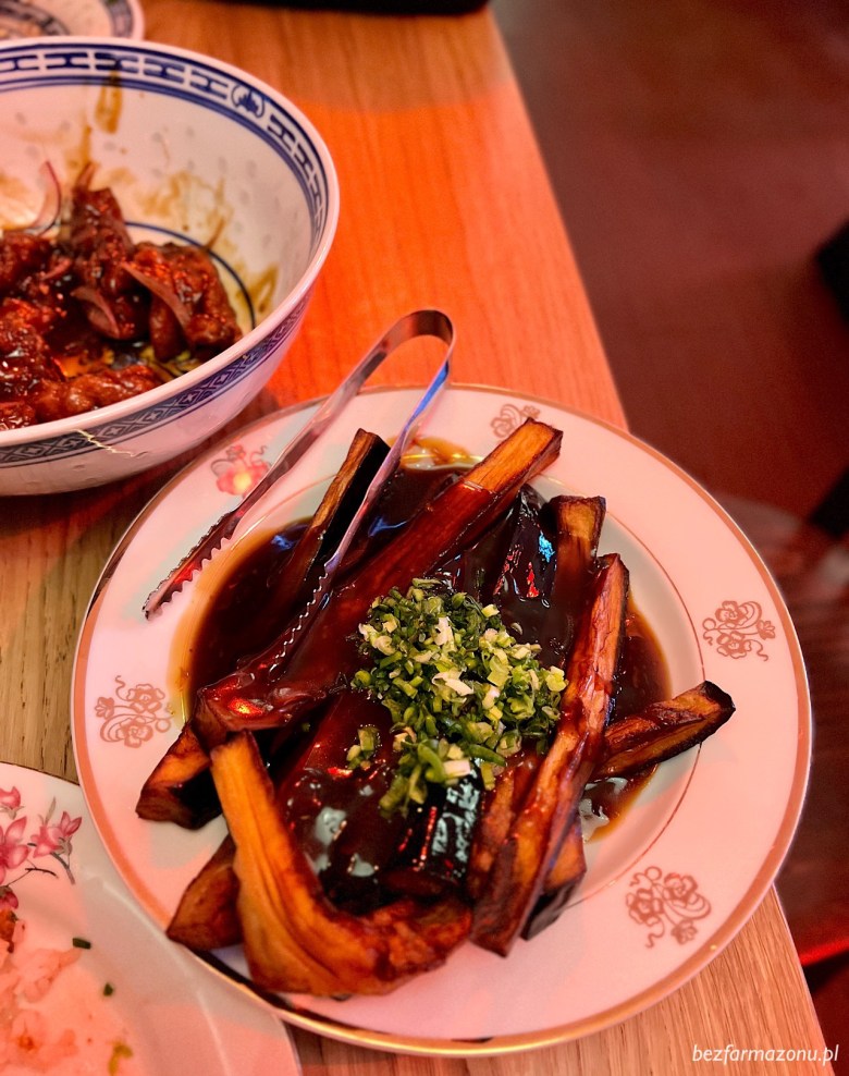 Smażonym na woku bakłażanom w sosie ze sfermentowanych nasion soi (31 PLN) na pewno nie można odmówić oryginalności. Miąższ był iście mięciutki, ale skórka już nie bardzo – wiele kawałków miało bardzo twardą i dla mnie niezjadalną. Bez wahania danie ochrzciliśmy najsłabszym tego wieczoru, ale wiem, iż ma swoich wiernych fanów.