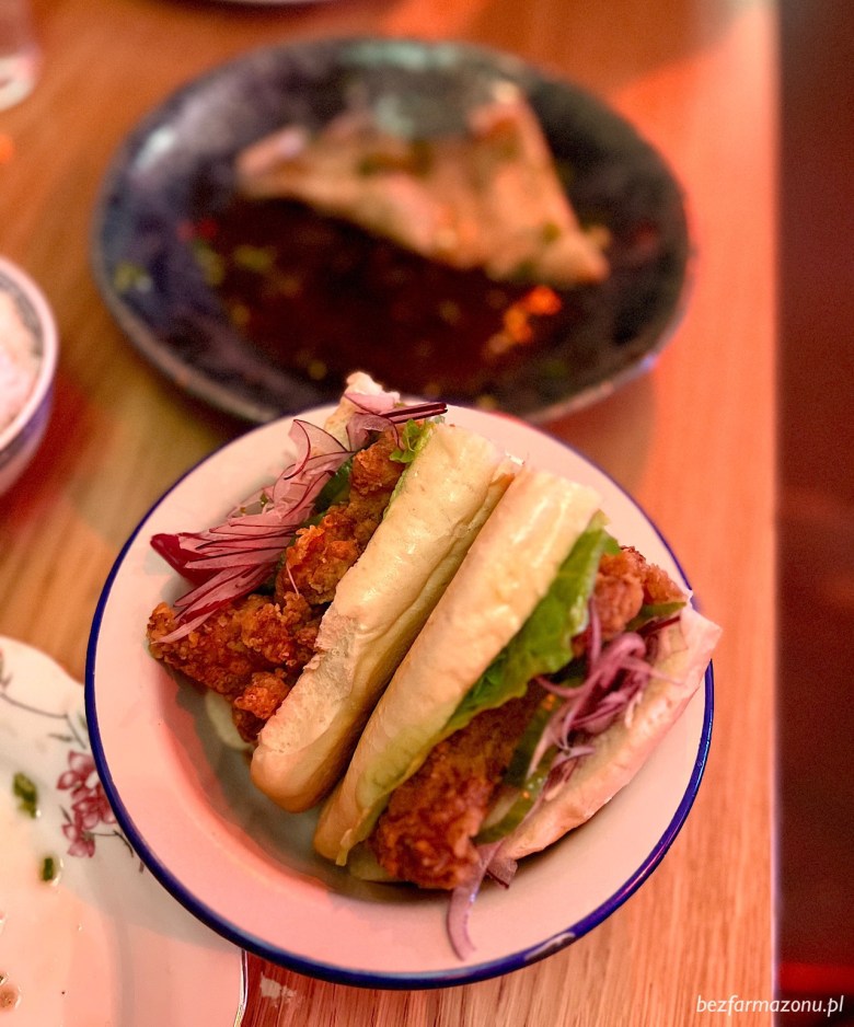 Fried Chicken Bun czyli bułka sztangielka ze smażonym kurczakiem (36 PLN) smaczna, ale nie tak bardzo jak się spodziewaliśmy. Owszem super rześka i dzięki relishowi z zielonych ogórków i aioli z dymki taka bardzo świeża, panierowany kurczak również spoko, ale całości brakowało kopa. Czegoś co by zachwyciło, i o czym można by śnić po nocach. Dodatkowo przedzielona na pół buła jest ogólnie mała.