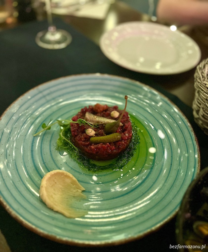 Tatar (36 PLN), oczywiście z siekanej wołowiny z lubczykowym masłem, korniszonami, sardelką, kaparem, masłem borowikowym i chlebem na zakwasie. Świeży i przepyszny.