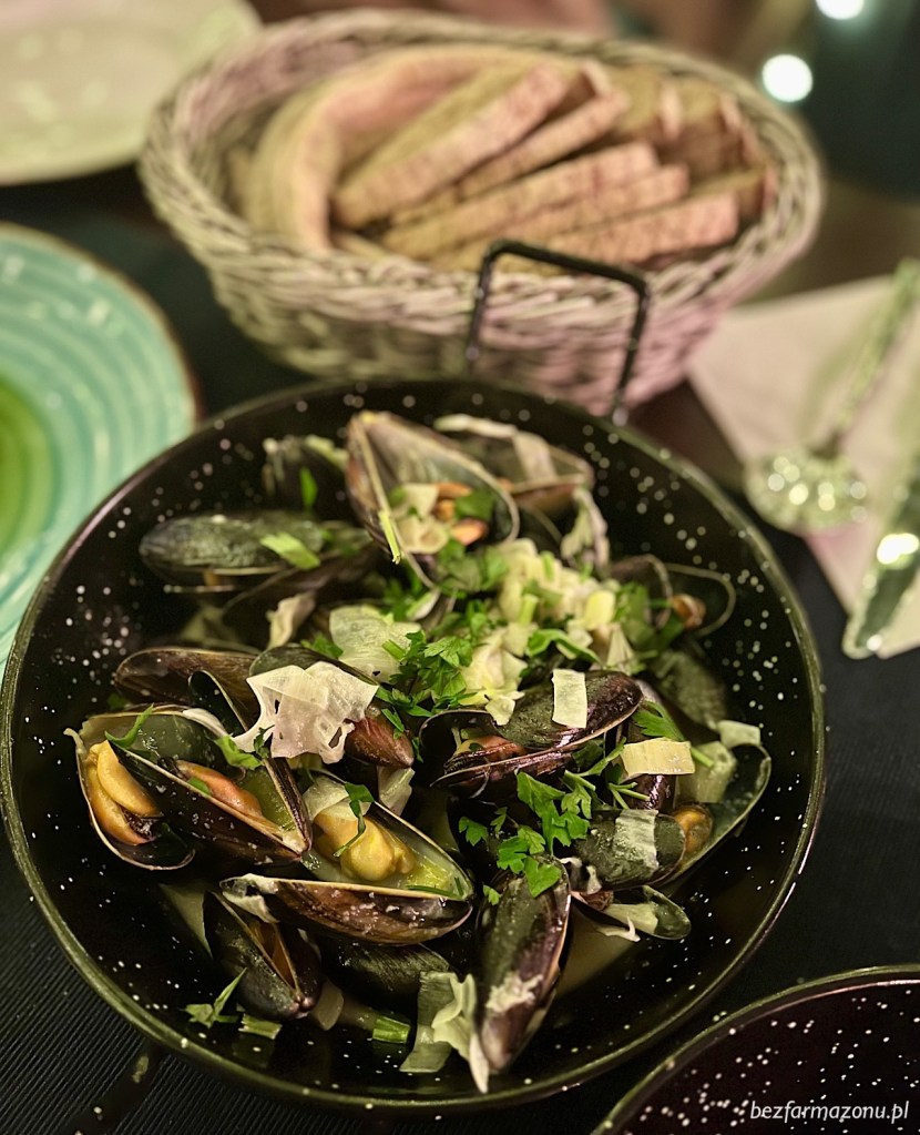 Mule (42 PLN) przyrządza się tu na trzy sposoby. Nasz 500 gramowy garczek wybraliśmy z porem, śmietaną i gorgonzolą. W składowych widniał też likier Cointreau, ale nikt z nas go nie wyczuł. Owoce morza smaczne, a sos iście wybitny.