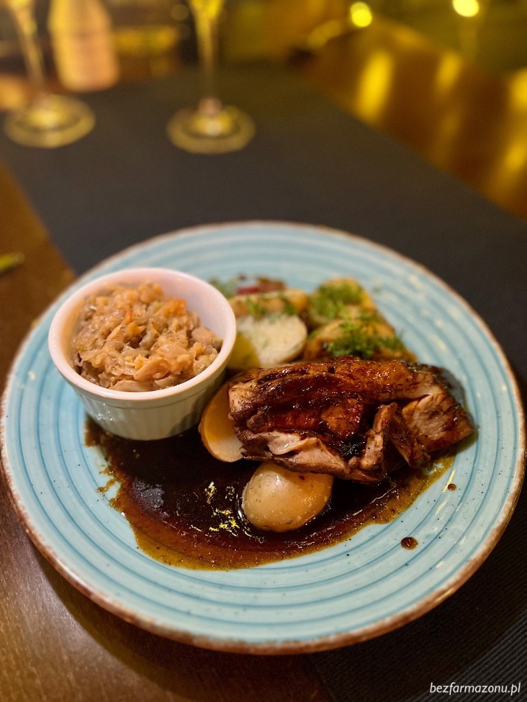 M. wybrała wolno pieczone żeberko w winno – miodowej marynacie z pieczonymi ziemniaczkami i kapuchą (42 PLN). Niesamowicie mięciutkie mięsko po obtoczeniu w gęstym, winnym sosie radowało od ucha do ucha.