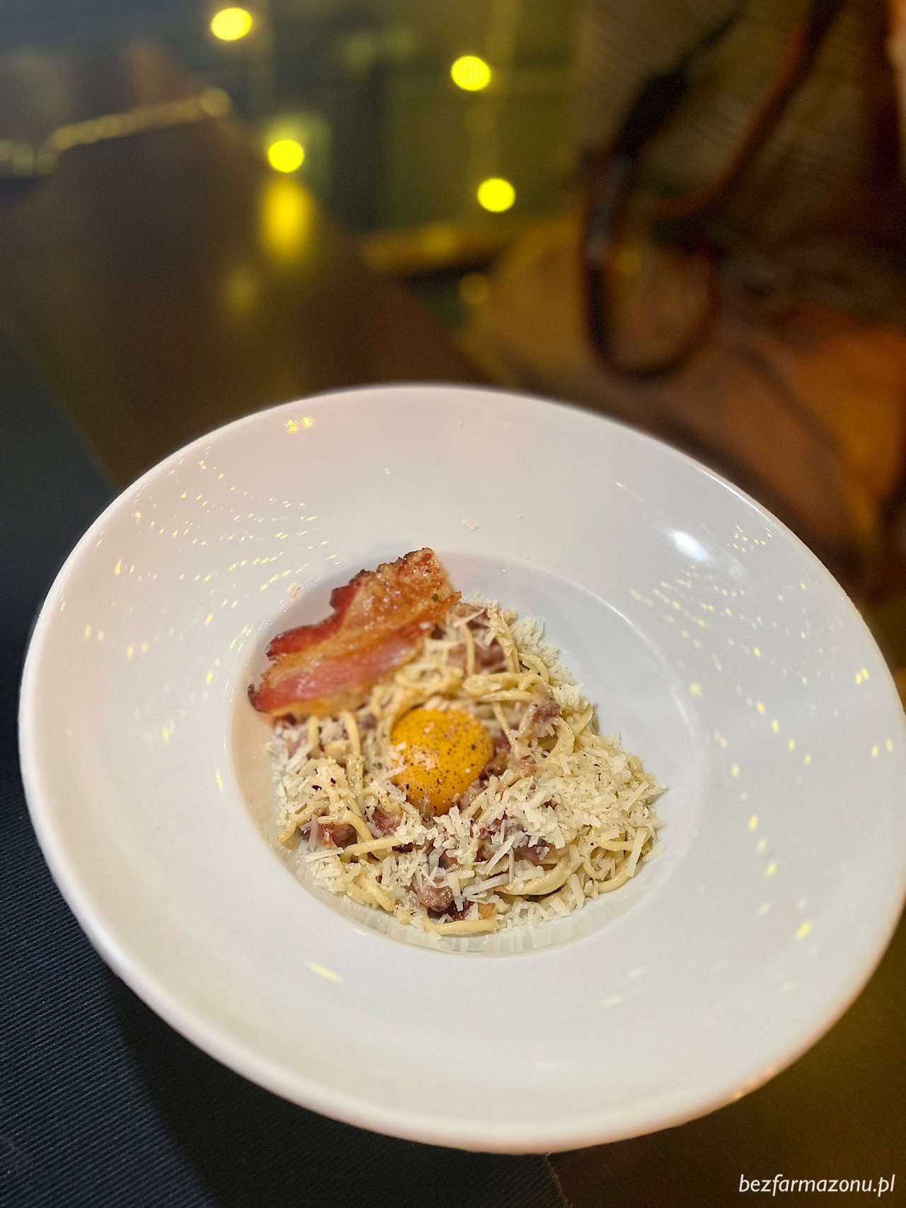 A. to nadworna testerka carbonary. Również i tym razem poprosiła o to powiedzmy sobie szczerze, często kontrowersyjne danie. Tutaj pastę przyrządzono według sztuki czyli bez śmietany, z żółtkiem, guanciale, pecorino romano i pieprzem. Makaron ugotowano idealnie, danie zatwierdziliśmy bez mrugnięcia okiem.