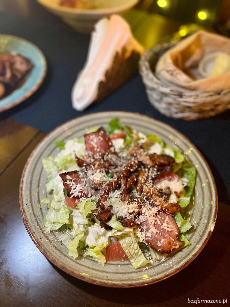 Owego dnia miałem bardzo słaby apetyt, więc ku zaskoczeniu dziewczyn poprosiłem o… sałatkę. Wybrałem Cezar Orient (34 PLN) i już na samym początku nieźle się zdziwiłem – jej głównym składnikiem była nie kurzęca pierś, acz posypane sezamem grillowane udko! Świeżości dodawał grejpfrut, chrupkości boczek, a umami parmezan.