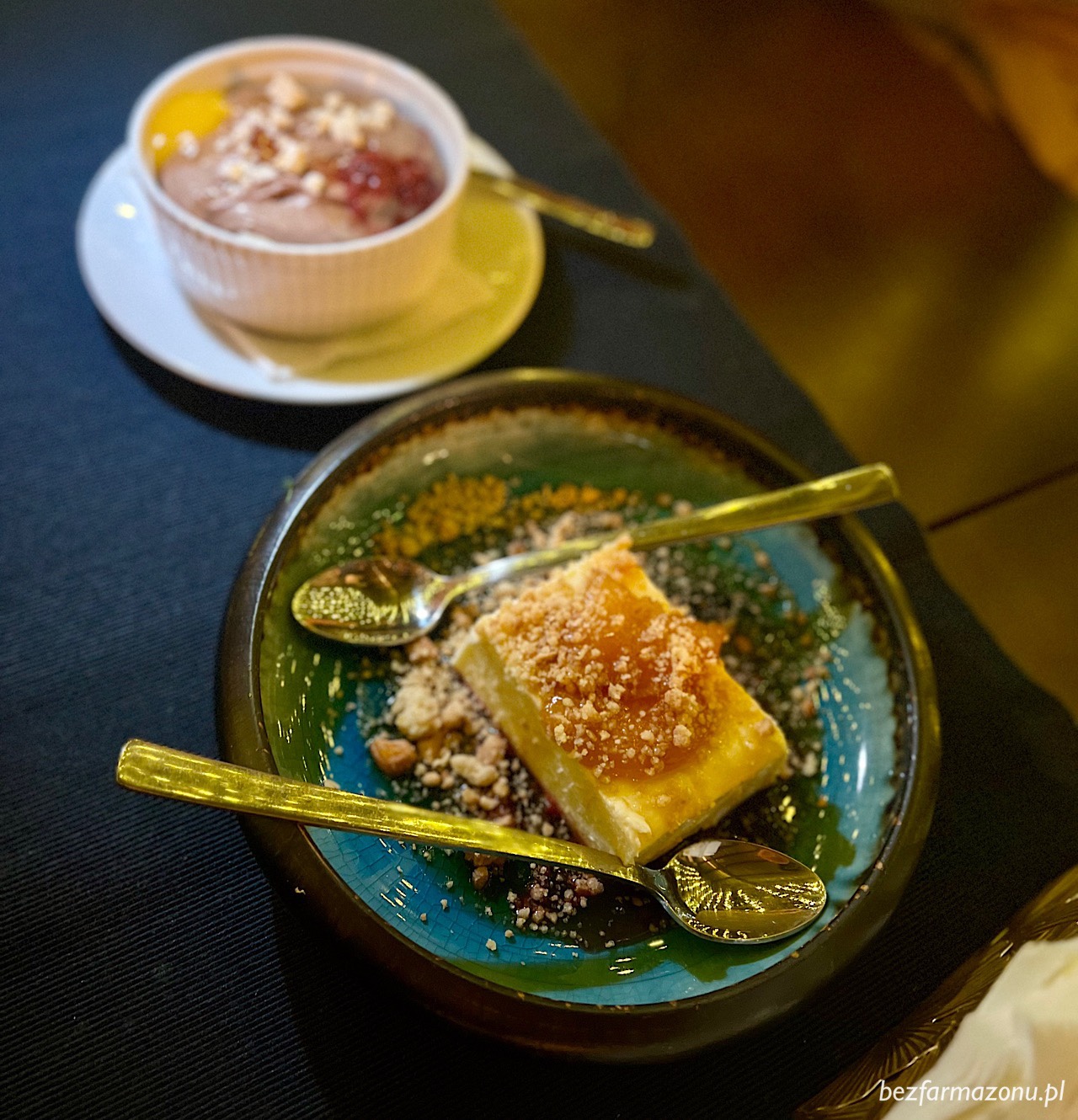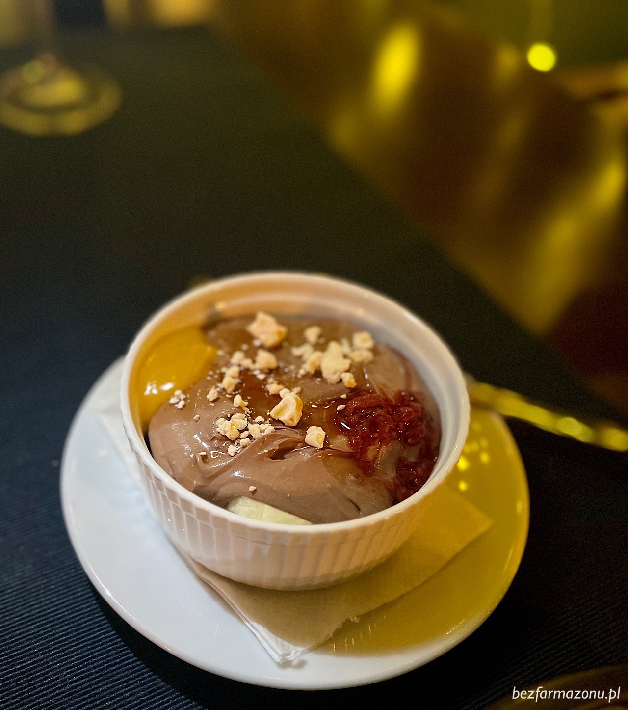 Nie obyło się bez deserów. Konkretnie dwóch. Spod lady niezły kremowy sernik (15 PLN), z karty czekoladowy mus z orzechową kruszonką i bananami (20 PLN) który niestety okazał się ciężki i przytłaczający.