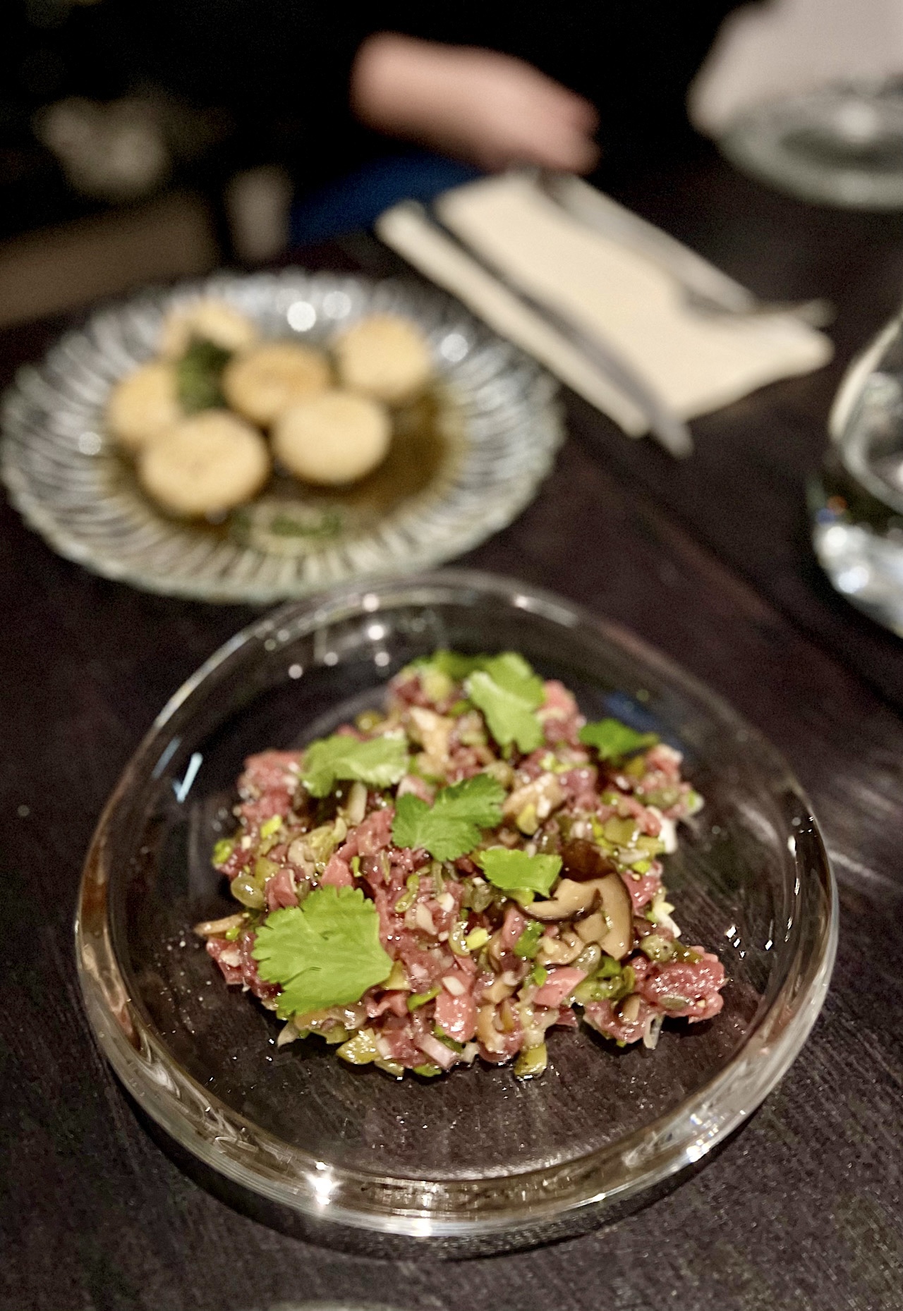 Tatar ze strusia z kaparami, szalotką, ogórkiem konserwowym, yuzu ponzu i shitake (45 PLN) okey, ale zgodnie zauważyliśmy iż pod natłokiem wszystkich wymienionych dodatków samo mięso się gubiło. Nie zamówiłbym ponownie.