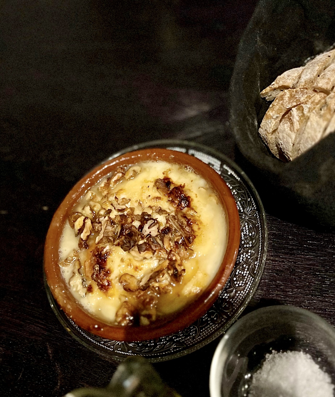 Pieczony francuski ser z orzechami włoskimi i miodem (55 PLN) to dodatek wręcz do wina obowiązkowy. Był tak obłędnie intensywny, iż z pomocą pieczywa wymietliśmy go do zera!