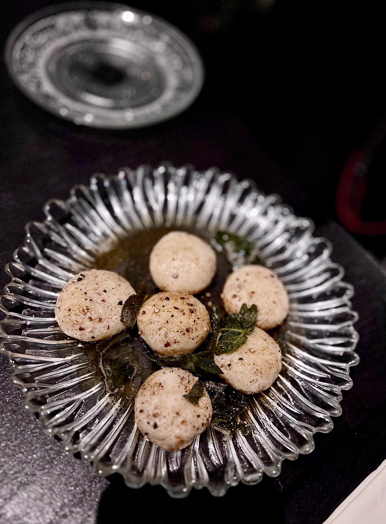 Gnudi (30 PLN) to nic innego jak włoskie kluski z ricotty. Przepis i forma podania z palonym masłem i szałwią jest stara jak świat i jednocześnie bardzo spoko.
