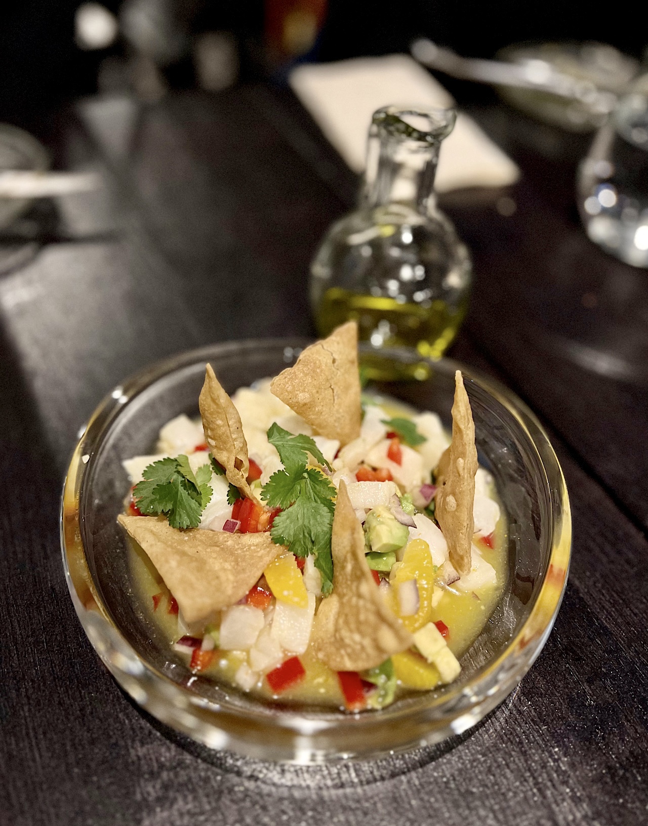 Ceviche z najlepszego dorsza na świecie – Skrei i wywodzącą się z Peru żółtą pastą de Aji Amarillo (45 PLN) bardzo, bardzo okey. Ani łagodne, ani bardzo ostre – takie w sam raz – z wyczuwalnym pieprzem, czosnkiem, cebulą i awokado.