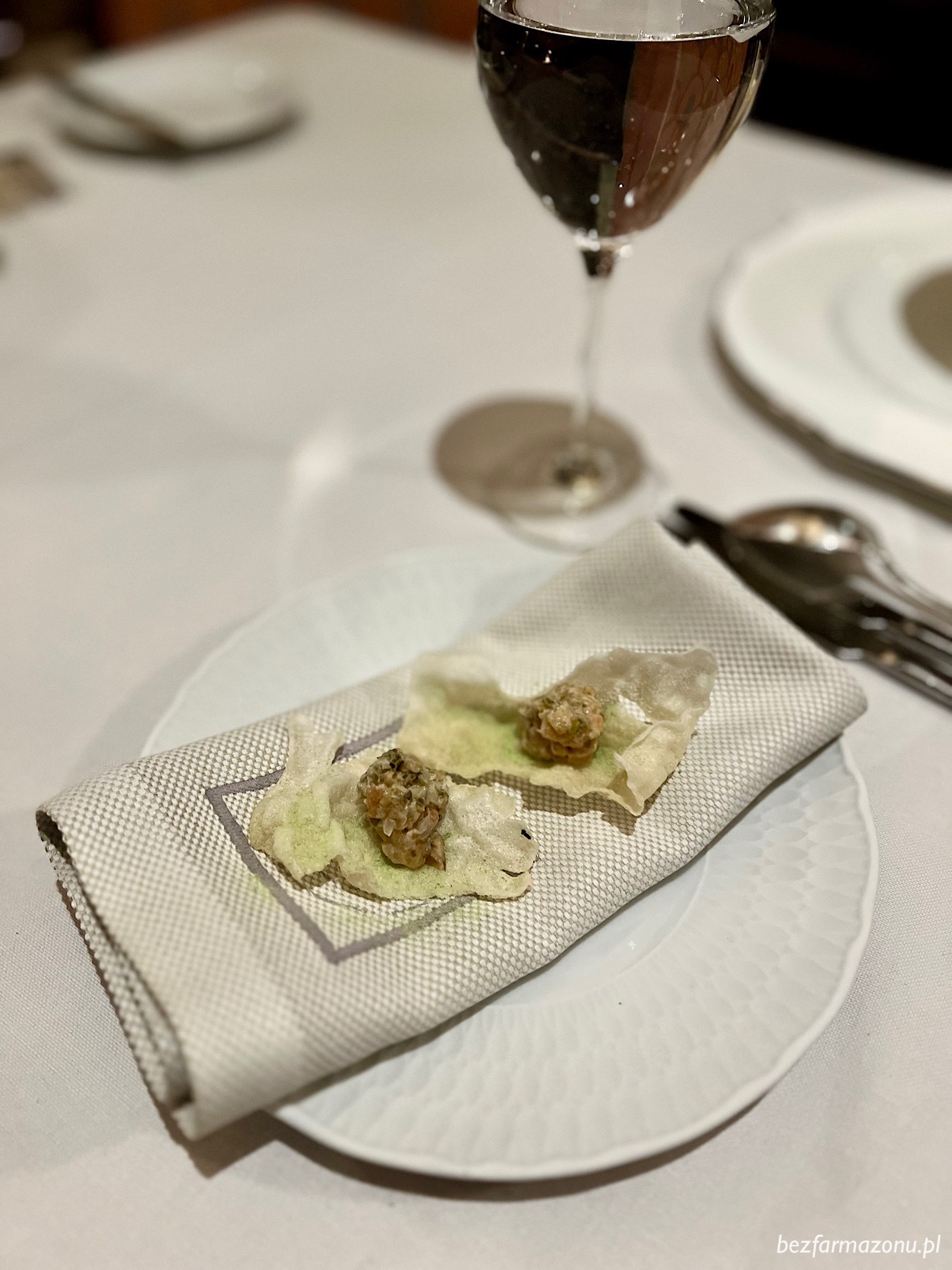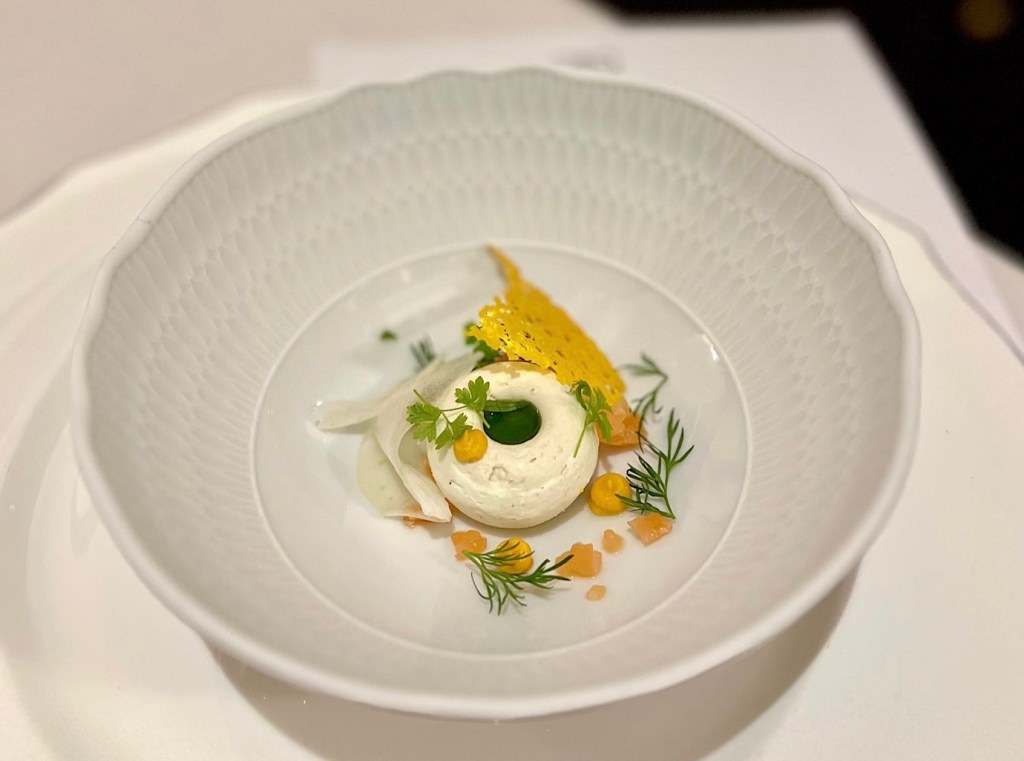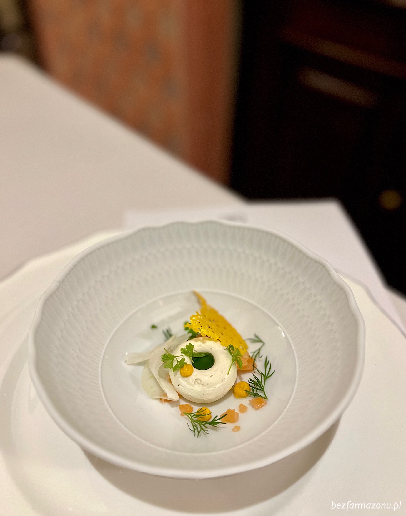 Kolację zapoczątkował poczęstunek szefa kuchni w dwóch odsłonach. Ultradelikatne bavarese z fenkuła z dynią, ricottą i łososiem (📸 lewe) oraz chips z tatara z łososia (📸 prawe).