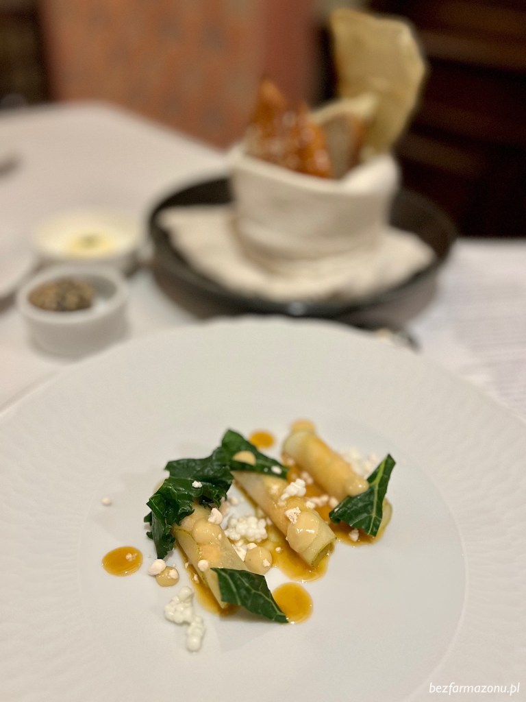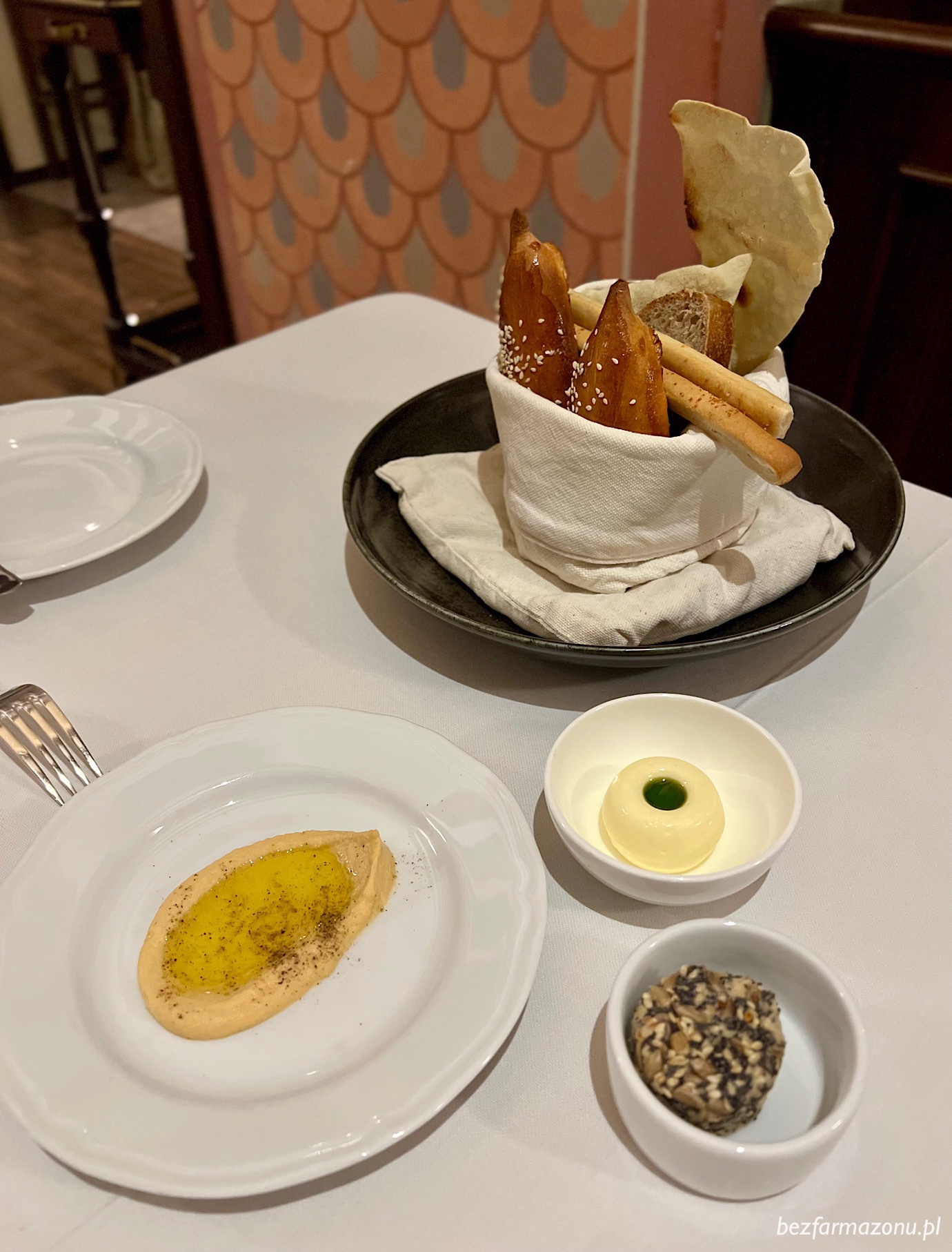 Kolacja w tak eleganckim miejscu nie mogłaby się oczywiście odbyć bez domowego pieczywa zaserwowanego ze słonym masłem z oliwą pietruszkową, hummusem oraz wegańskim pasztetem z sezamem.