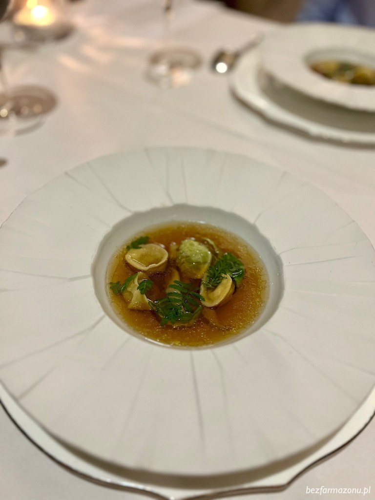 Ravioli z mięsem z ogonów wołowych kelner zalał wybitnym, charakternym bulionem z tegoż samego mięsa. W bulionie taplały się boczniaki oraz brukselka, a mięso występujące w pierożkach pukało do bram kulinarnych wyżyn.