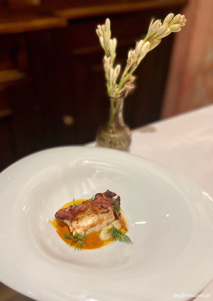 Po delikatnym połechtaniu żołądków pojawił się dorsz. Morskiego drapieżnika przygotowano dokładnie tak jak można sobie tego życzyć, a w zestawieniu ze słodkim czosnkowo – miodowym musem oraz pikantnym chorizo, talerz prezentował nad wyraz oryginalne walory smakowe.