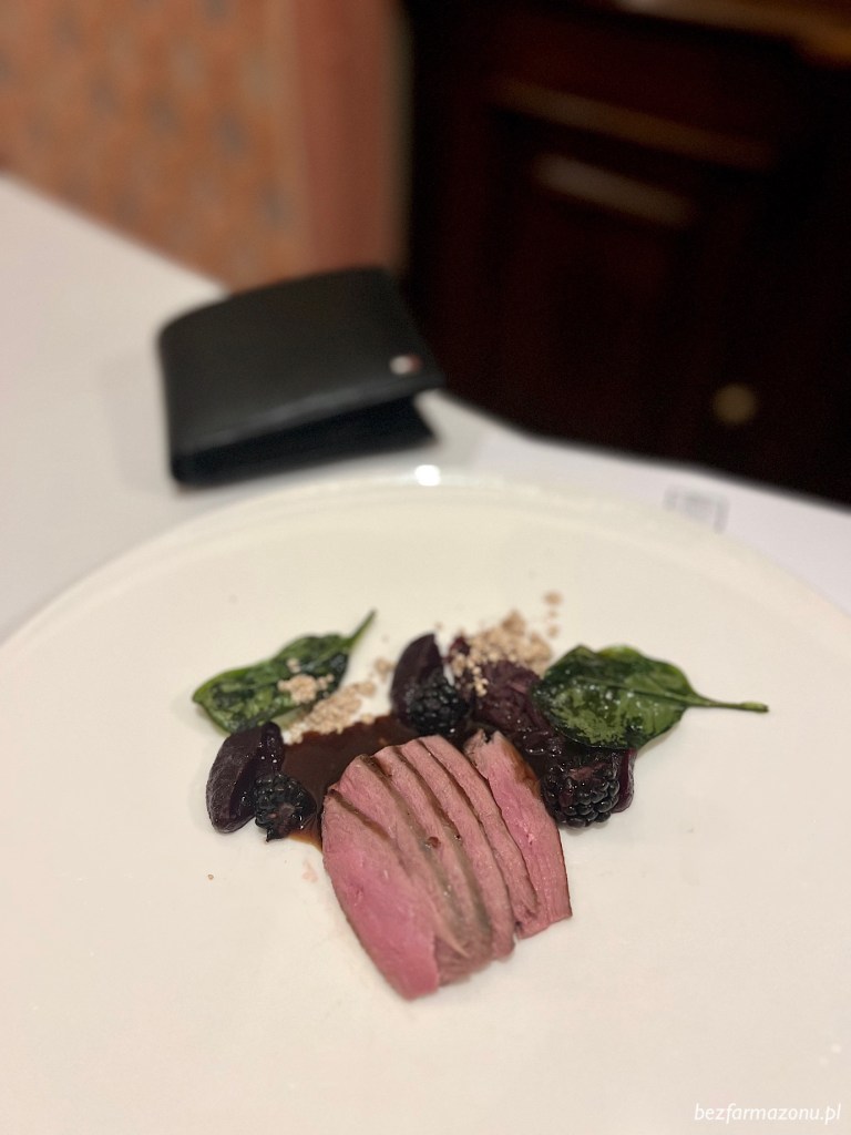 Tuż po nim ujrzeliśmy mięciutką kaczą pierś z jeżynami, gotowaną w czerwonym winie cebulę oraz mus z czerwonej kapusty. Ciekawy zabieg wykonano na kaczej skórce, mianowicie uprażono ją do mikro ziarenek o konsystencji popcornu. Świetny pomysł i co najważniejsze owy twór jak najbardziej skórką smakował.