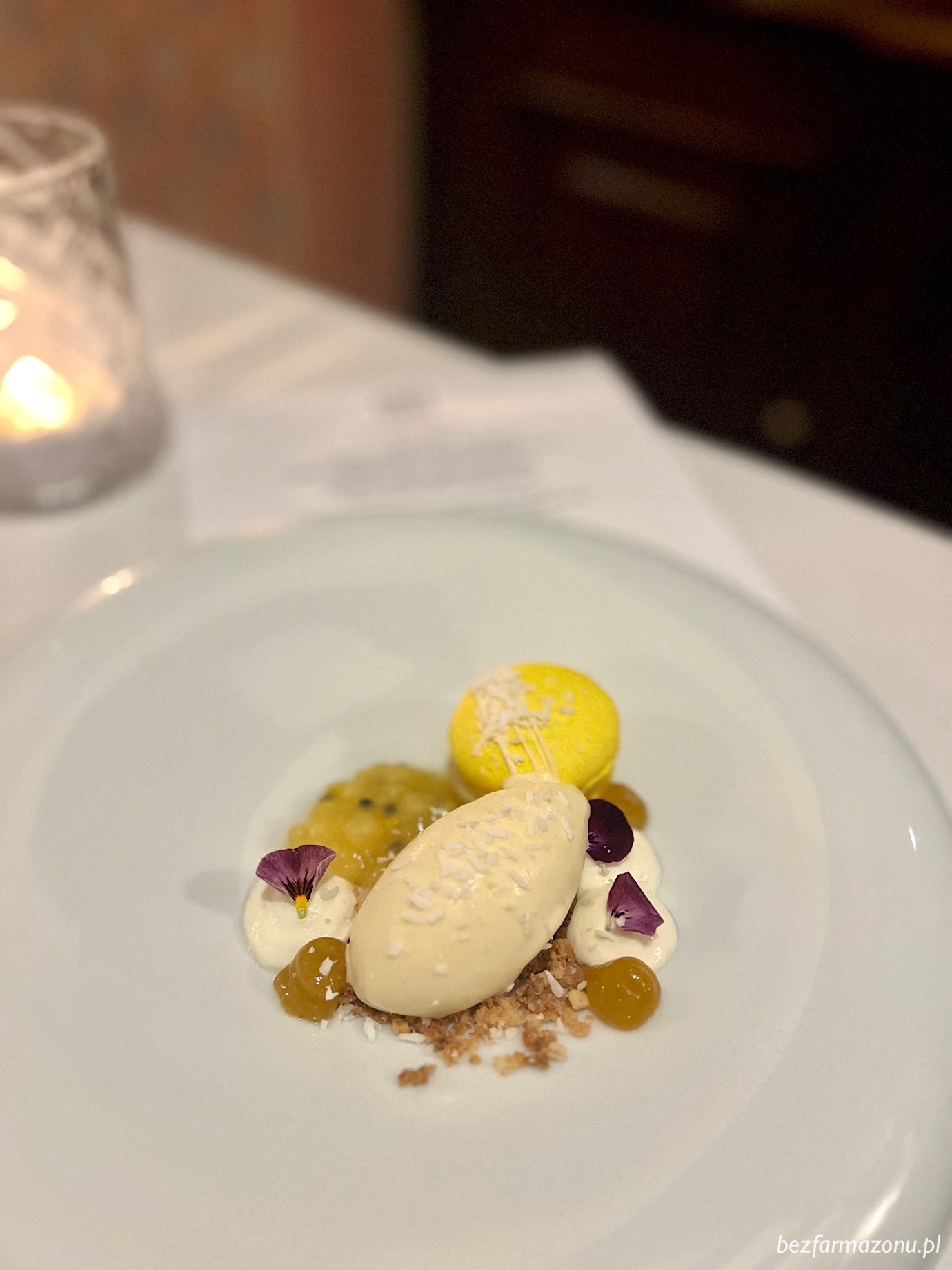 Lody o smaku pinacolady z wybornym nieprzesłodzonym makaronikiem, kruszonym miodem, ananasowo – marakujową konfiturą i waniliowym kremem okazały się dla mnie gwiazdami wieczoru.