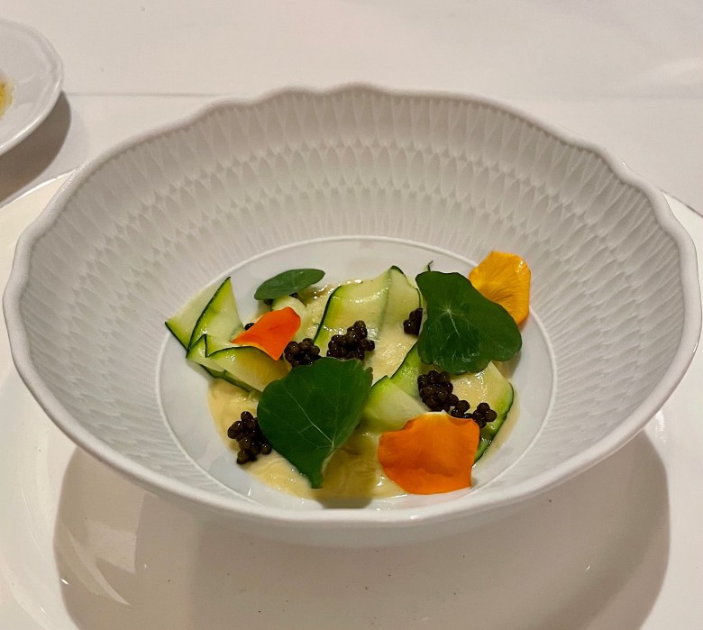 Kolejne danie – szafranowe risotto z cukinią udekorowano kawiorem z jesiotra i nasturcją. Tej konkretnej pozycji akurat zapomniałem zrobić zdjęcie, ale sytuację uratował kolacyjny towarzysz który całe szczęście również dokumentował przebieg kolacji.