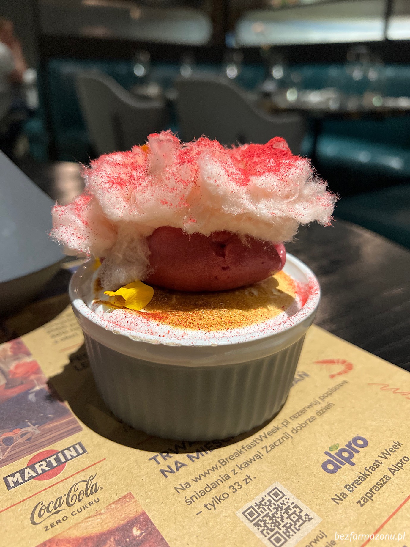 Na koniec sernik, łagodzony przez malinowy sorbet, który to znowu osładzała wata cukrowa. Deser pomysłowy i satysfakcjonujący