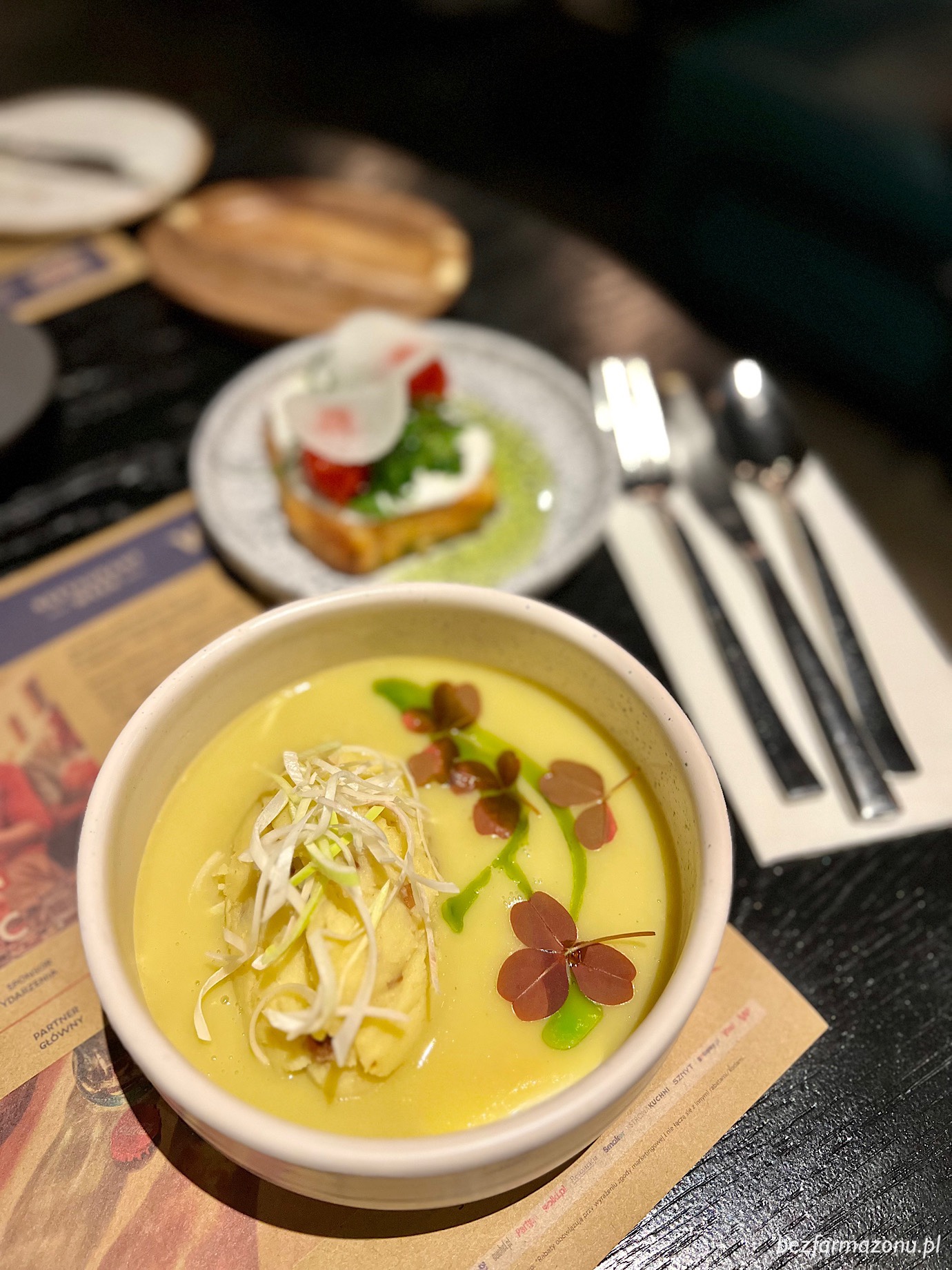 Bardzo pozytywnie zaskoczył gęsty i gorący krem z młodych porów z wędzoną słoniną oraz jajkiem zielononóżki. Intensywny i super sycący.