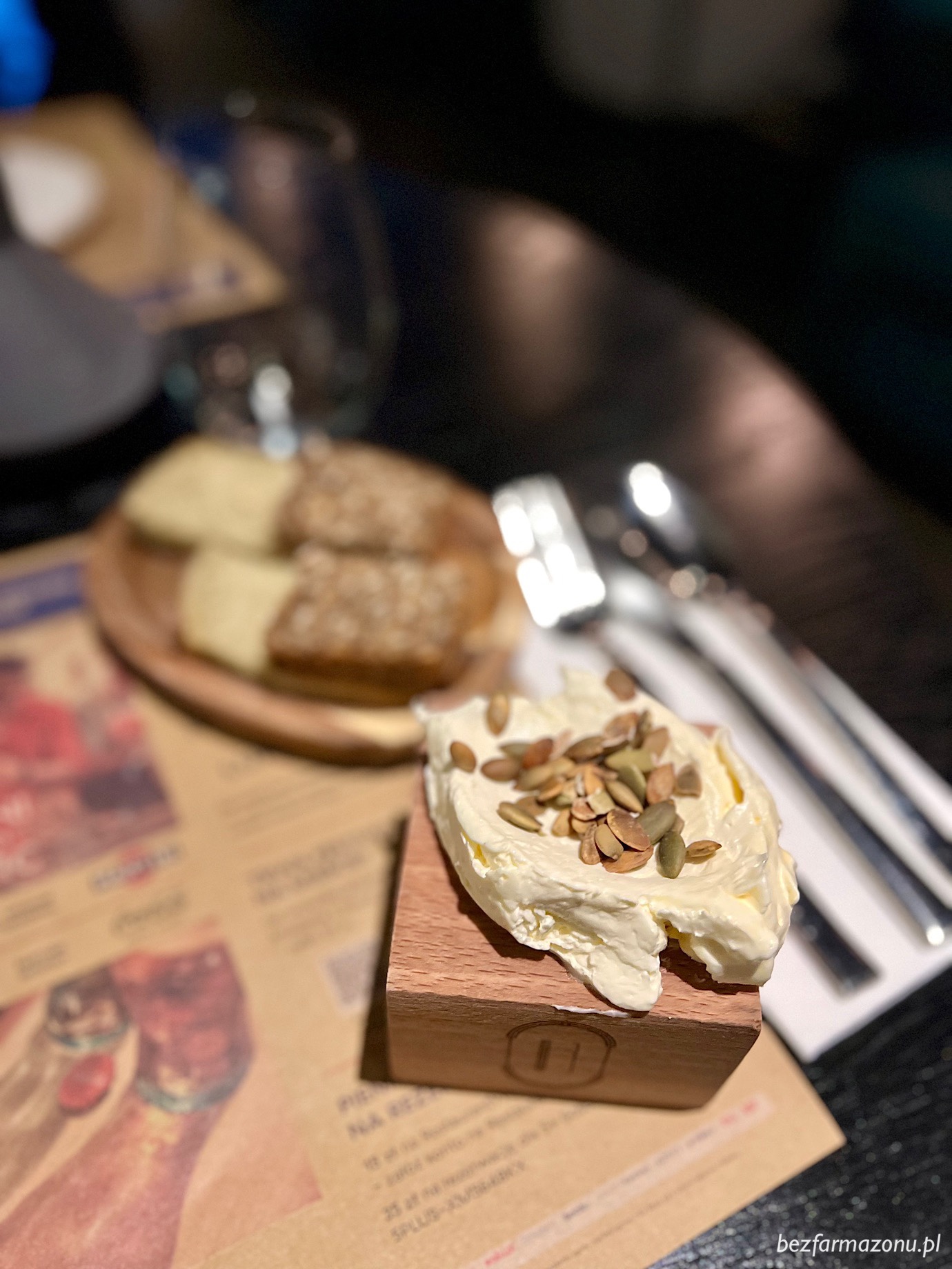 K. zajadała się haluszkami, czyli ziemniaczanymi kluseczkami w sosie grzybowym. W karcie jest również mowa o paście truflowej, ale jeśli występował,a to w ilości mikro, gdyż trufli kompletnie nie było tutaj czuć. Zamiast sera Bursztyn zaserwowano inny, zdecydowanie mniej intensywny. Ogólnie rzecz mówiąc najsłabsze danie wieczoru – po opisie spodziewałem się eksplozji umami, a kolokwialnie pisząc wiało nudą.