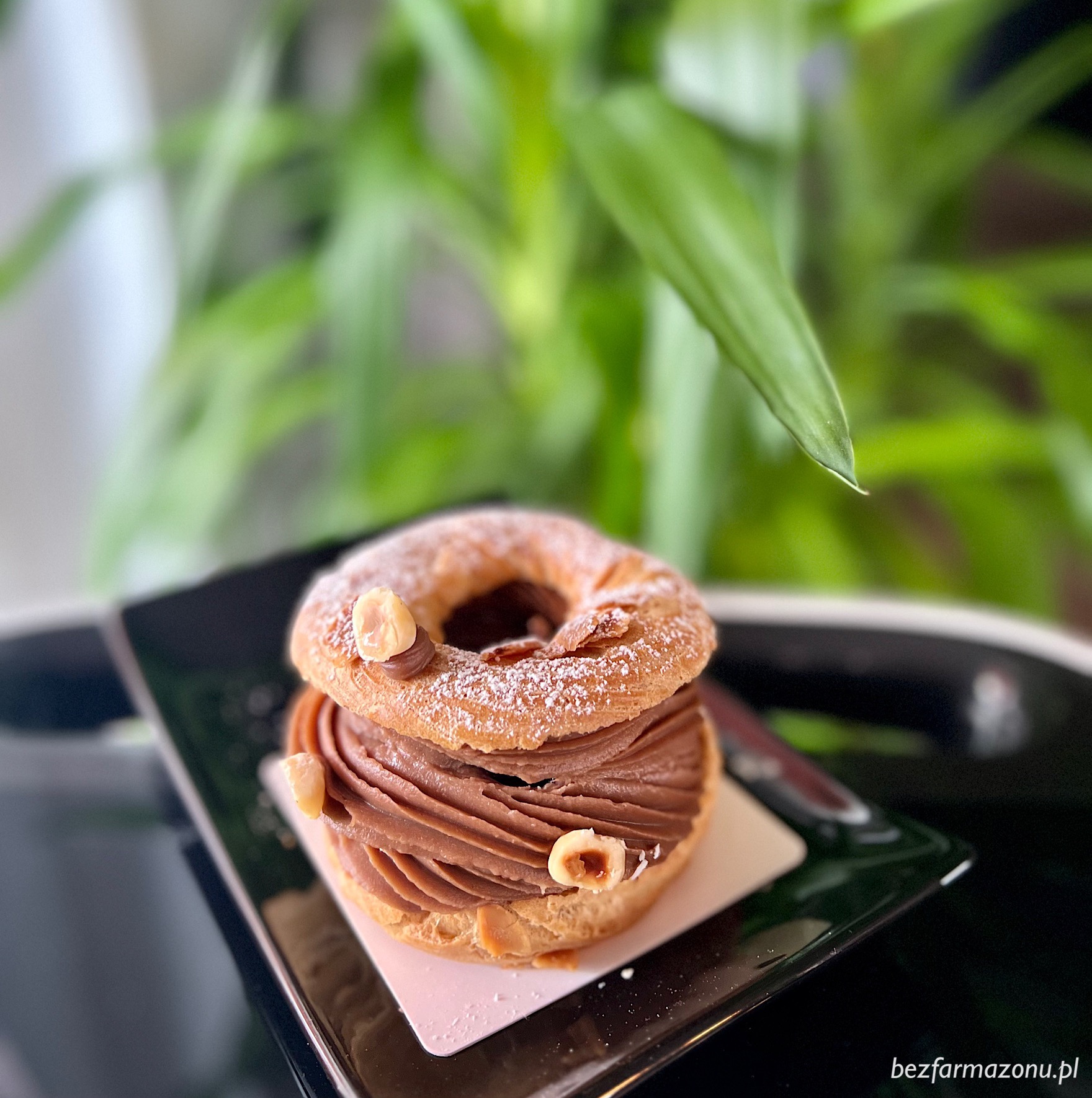 - Paris Brest z orzechowo – czekoladowym cremeux, pralinką oraz kwaskowatą konfiturą z owoców leśnych.