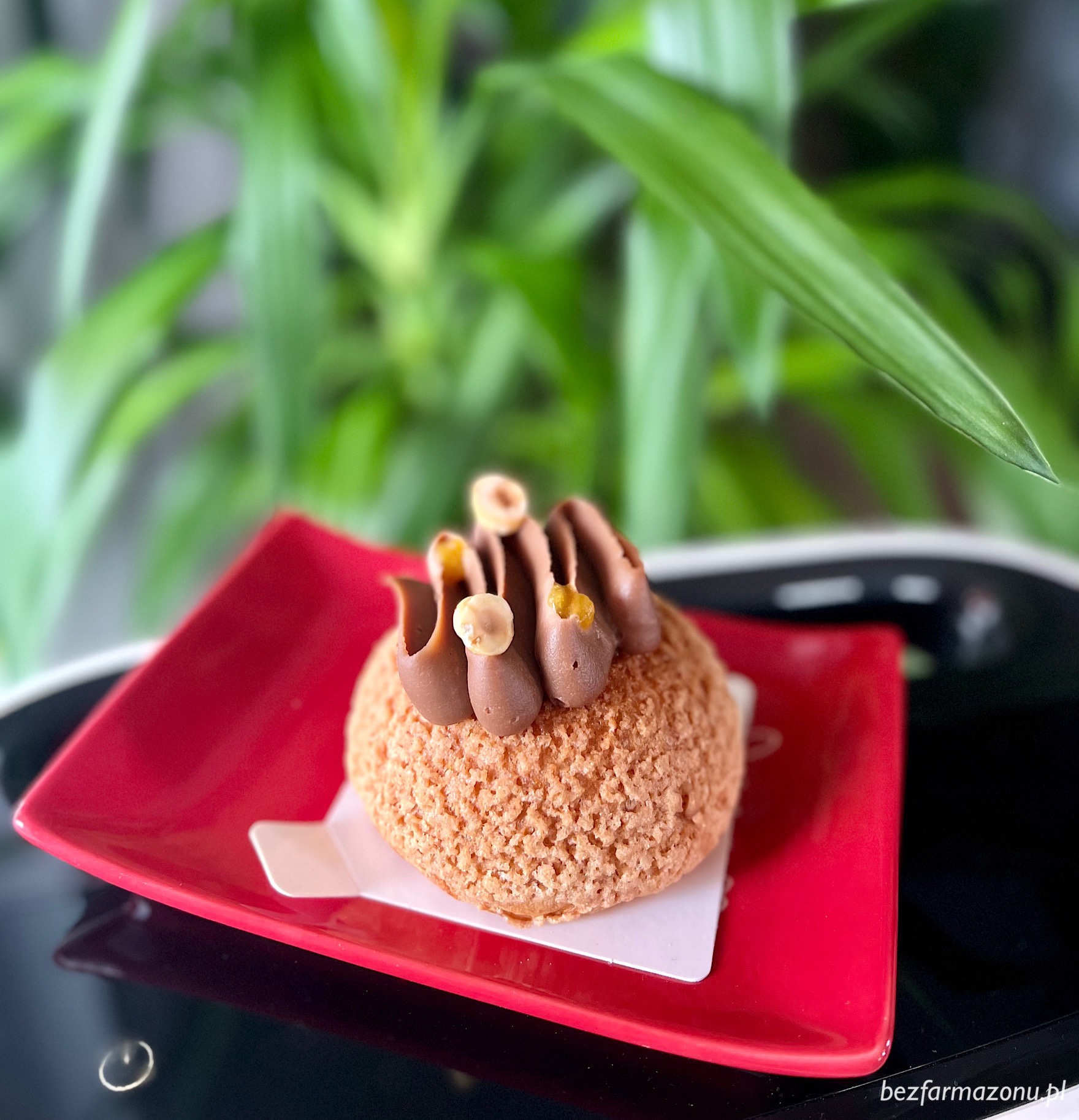 - ptysia gianduja z chrupiącą pralinką, konfiturą z marakui, prażonymi laskowymi, waniliowym patissiere w środku i orzechowo – mlecznym cremeux na wierzchu;