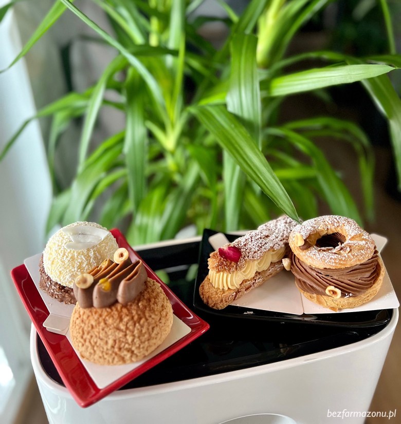 - eklera Baileys z chrupiącą pralinką, cremeux na bazie Baileys’a i białej czekolady oraz konfiturą jeżynową;