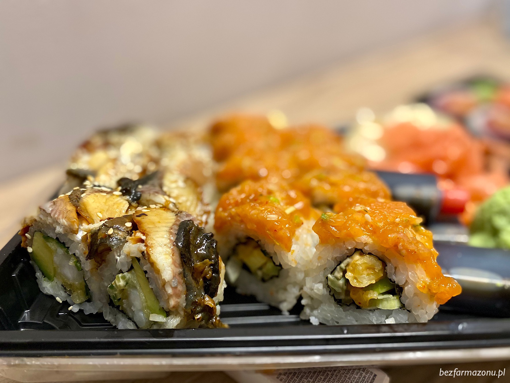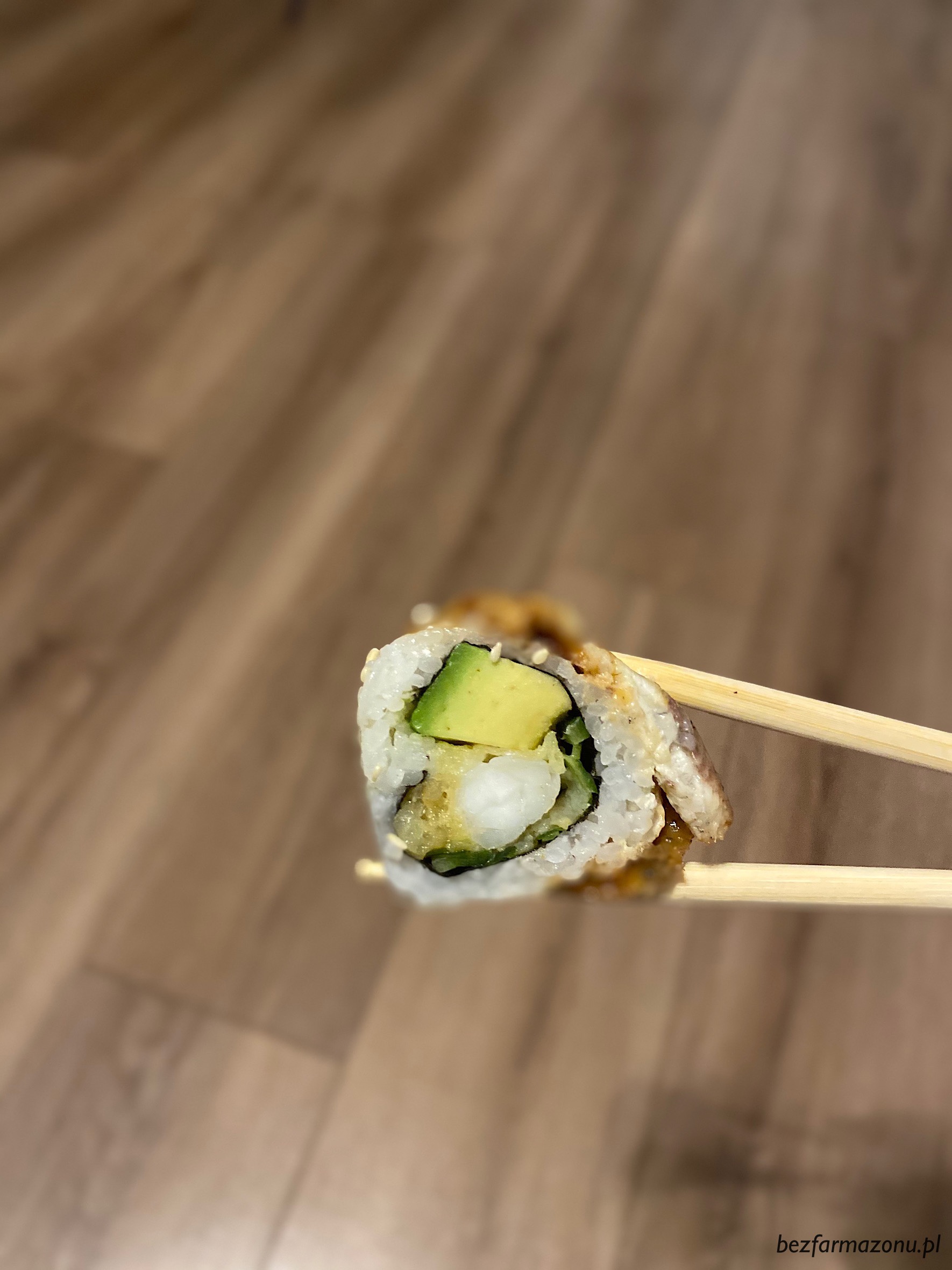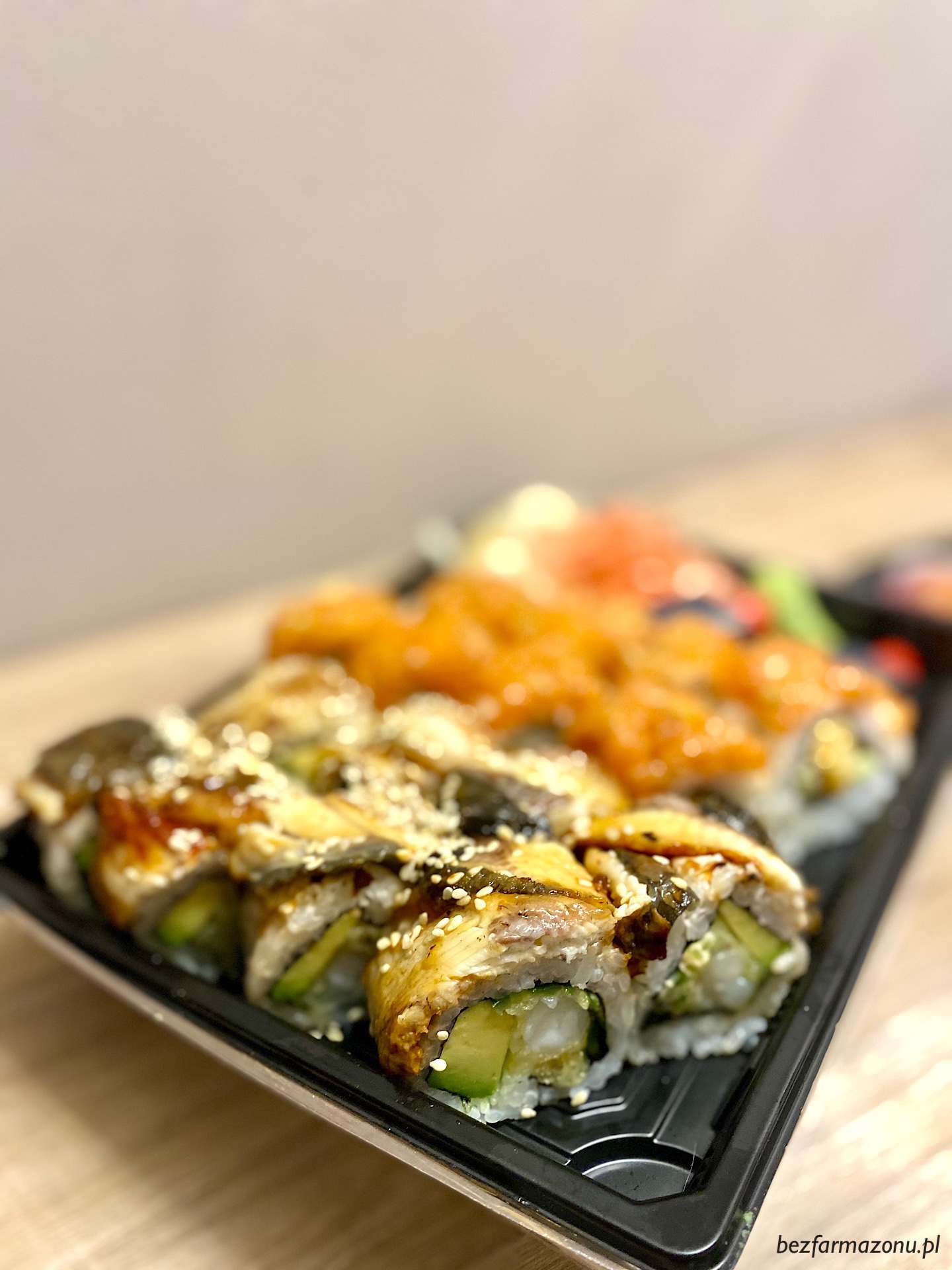 … oraz opatrzone przypalanym węgorzem Dragon Roll (40 PLN) z krewetką w tempurze, ogórkiem, awokado, sosami kobe i kabayaki