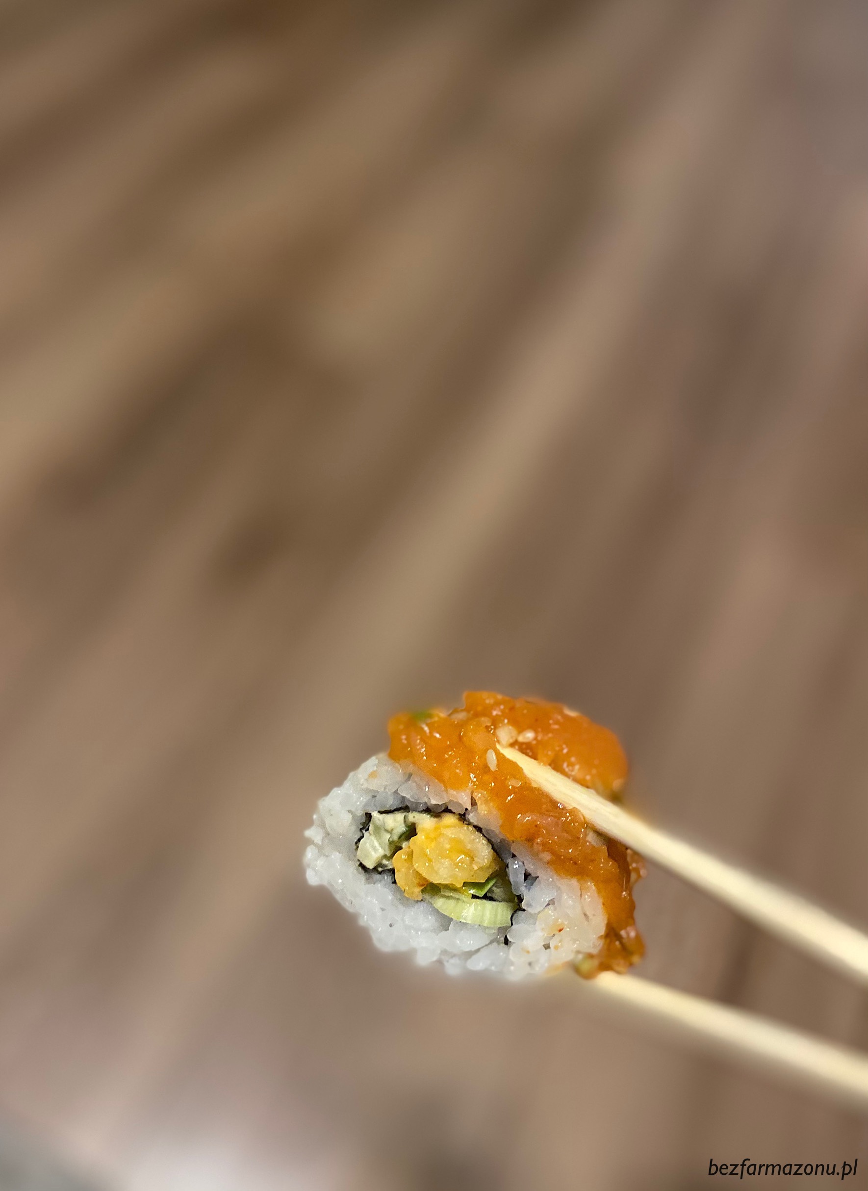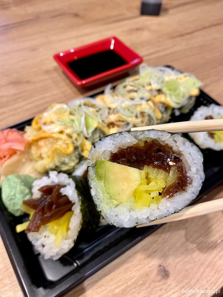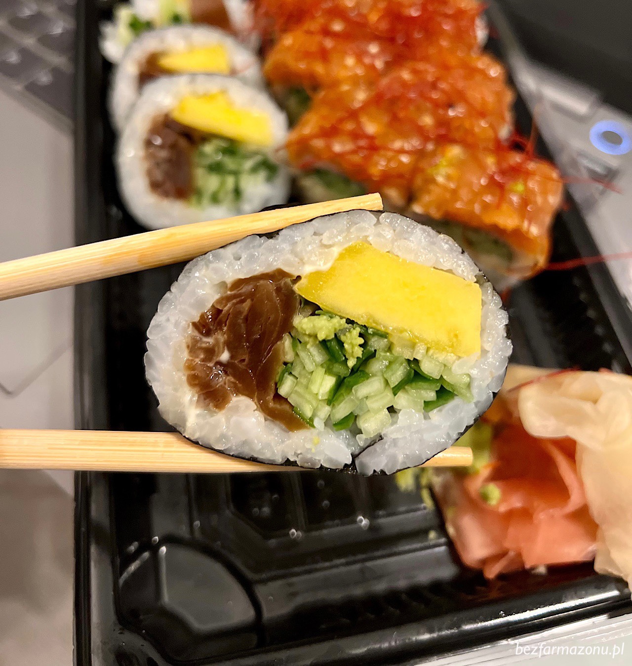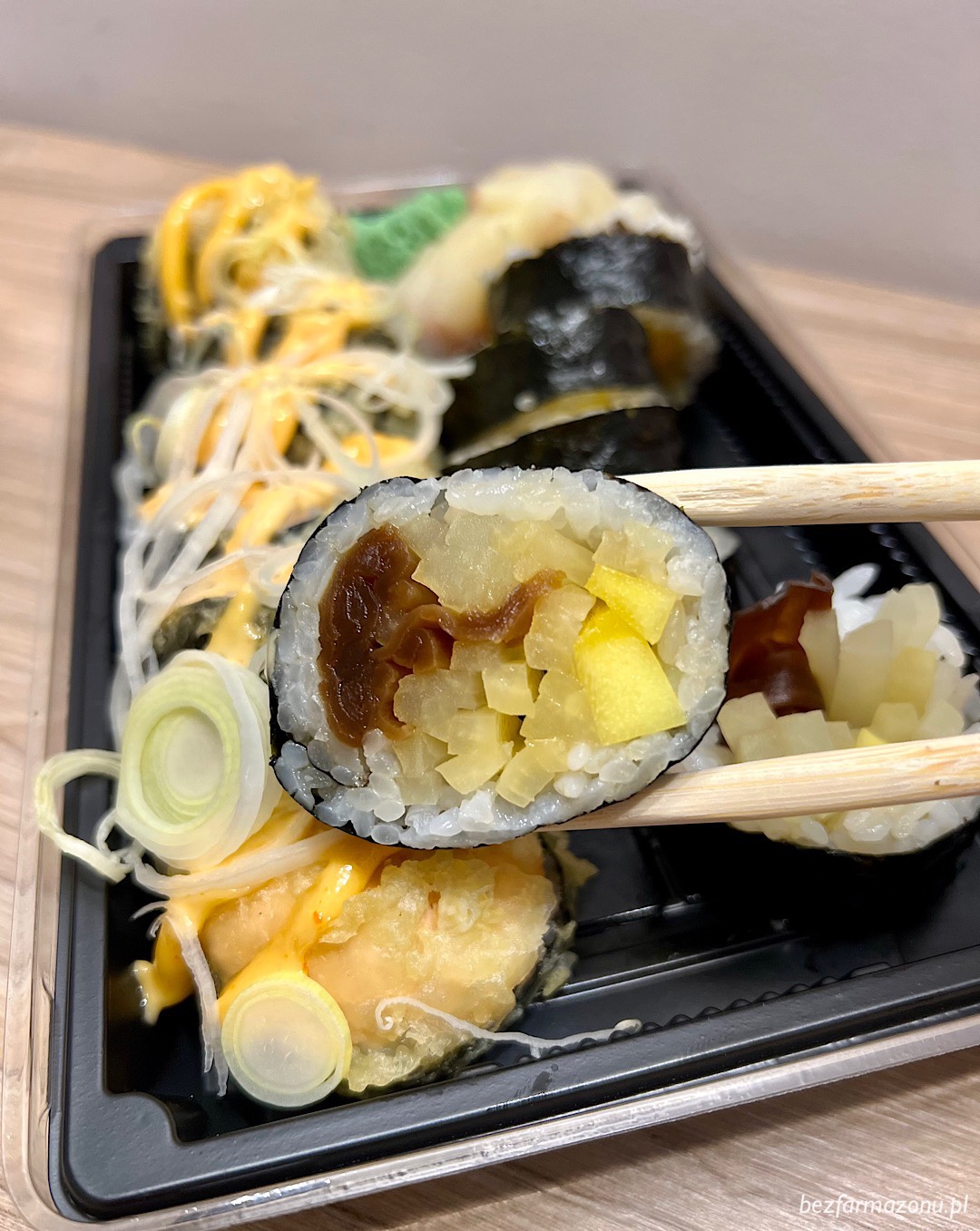 Drugą rolką była najprostsza z karty wegetariańska futomaki (6 szt – 21 PLN). Tutaj, tym co może zaskakiwać jest możliwość skonfigurowania własnej kompozycji. Do wyboru 3 z 9-ciu możliwych składników + jeden z 4-ech sosów. Moją rolę zbudowałem na sosie teryiaki z tykwą, mango i oshinko.