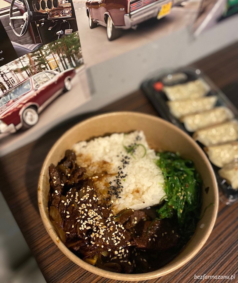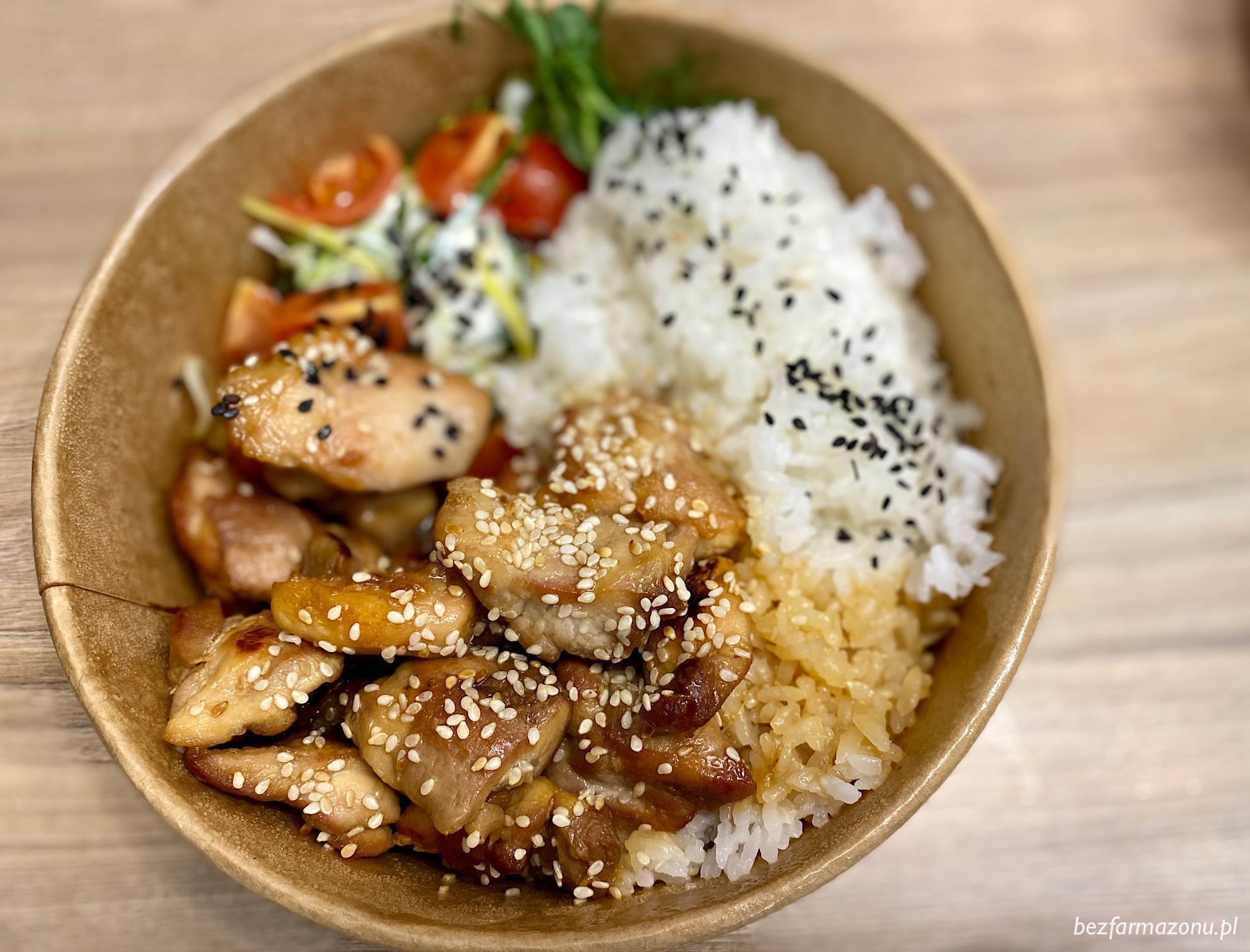 Tori teriyaki (30 PLN) to smażone wraz ze skórką, posypane sezamem, miękkie i soczyste mięso z ud kurczaka. Podane z doskonałym ryżem i nietypową jak na kuchnię azjatycką surówko – sałatką z koktajlowymi, glonami i słodką śmietaną. Na spodzie pudełka odnalazłem sos teriyaki który po dokładnym wymieszaniu z ryżem stworzył słodko – wyborną mieszankę. Danie trafiło w moje gusta.