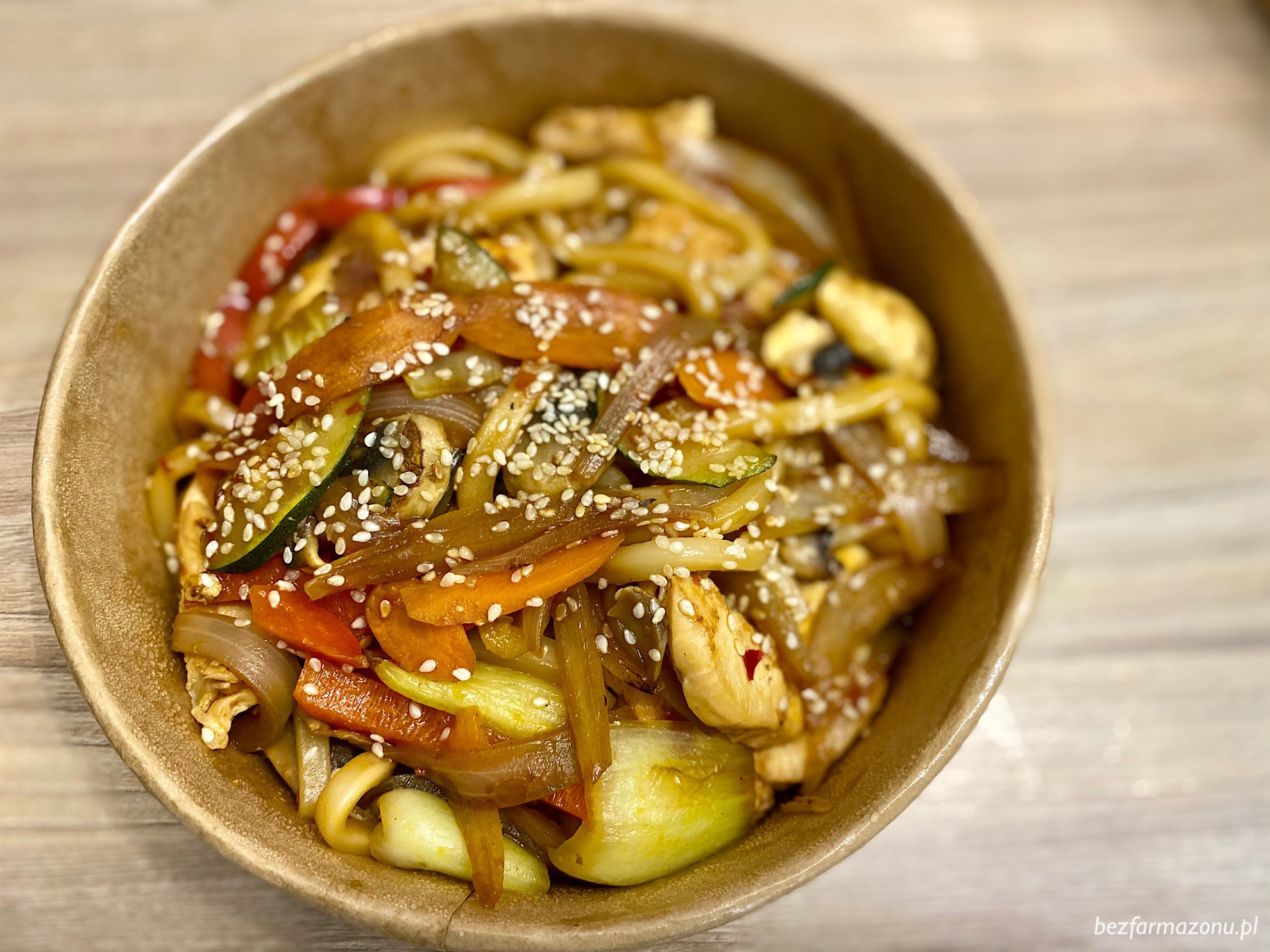 Udon kurczak (30 PLN) to nic innego jak gruby makaron z cyckami kury i warzywami (papryka, pieczarki, cebula). Tutaj o słodyczy nie było już mowy, a w tle przebijały się pikantne nuty chili.