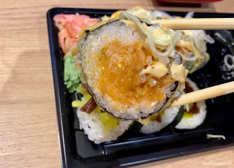 Chrupiący tatar (6 szt – 30 PLN) bez nawijania makaronu na uszy jest mistrzem świata! „Otempurzona” rolka skrywa łososia, a na jej wierzchu znajdziecie pora i sos kobe. Ilość pora trochę przeraża, ale tak czy siak ciepła, wilgotna i chrupiąca rolka wymiata.