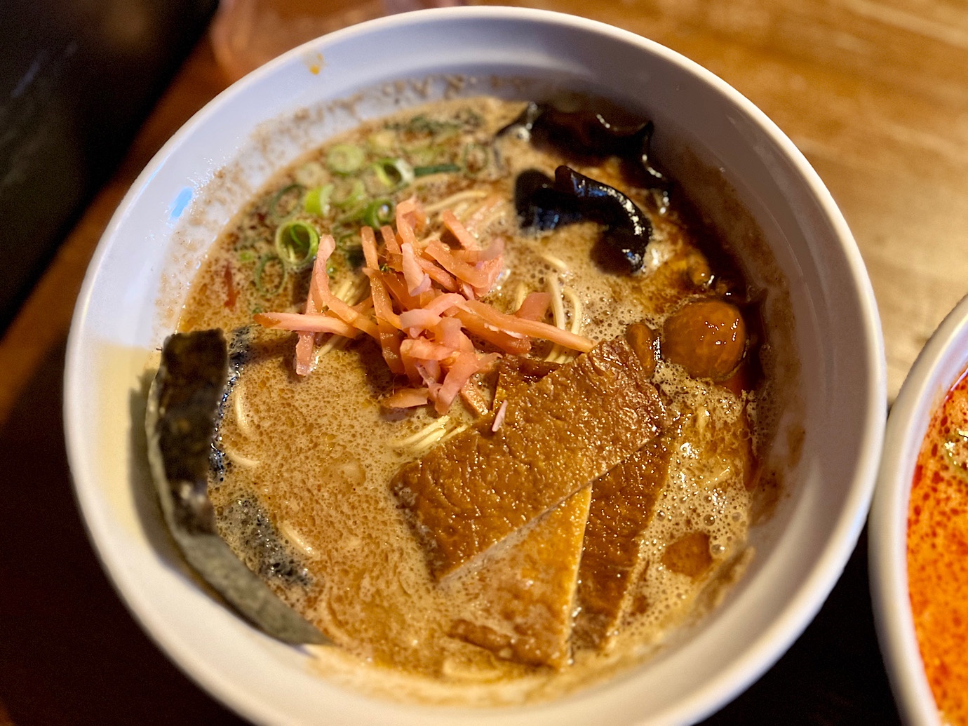 Vegan Tonkotsu (40 PLN) bez dwóch zdań był najlepszym i najbardziej umamicznym ramenem wegańskim jaki jadłem w życiu. Nie wiem jakim cudem ramenmasterzy wyciągneli aż takie pokłady umami z mleka sojowego, kombu i grzybów, ale bulion po prostu rozkładał na łopatki. I te wybitne plastry tofu – miękkie i słodziutkie. Ah!