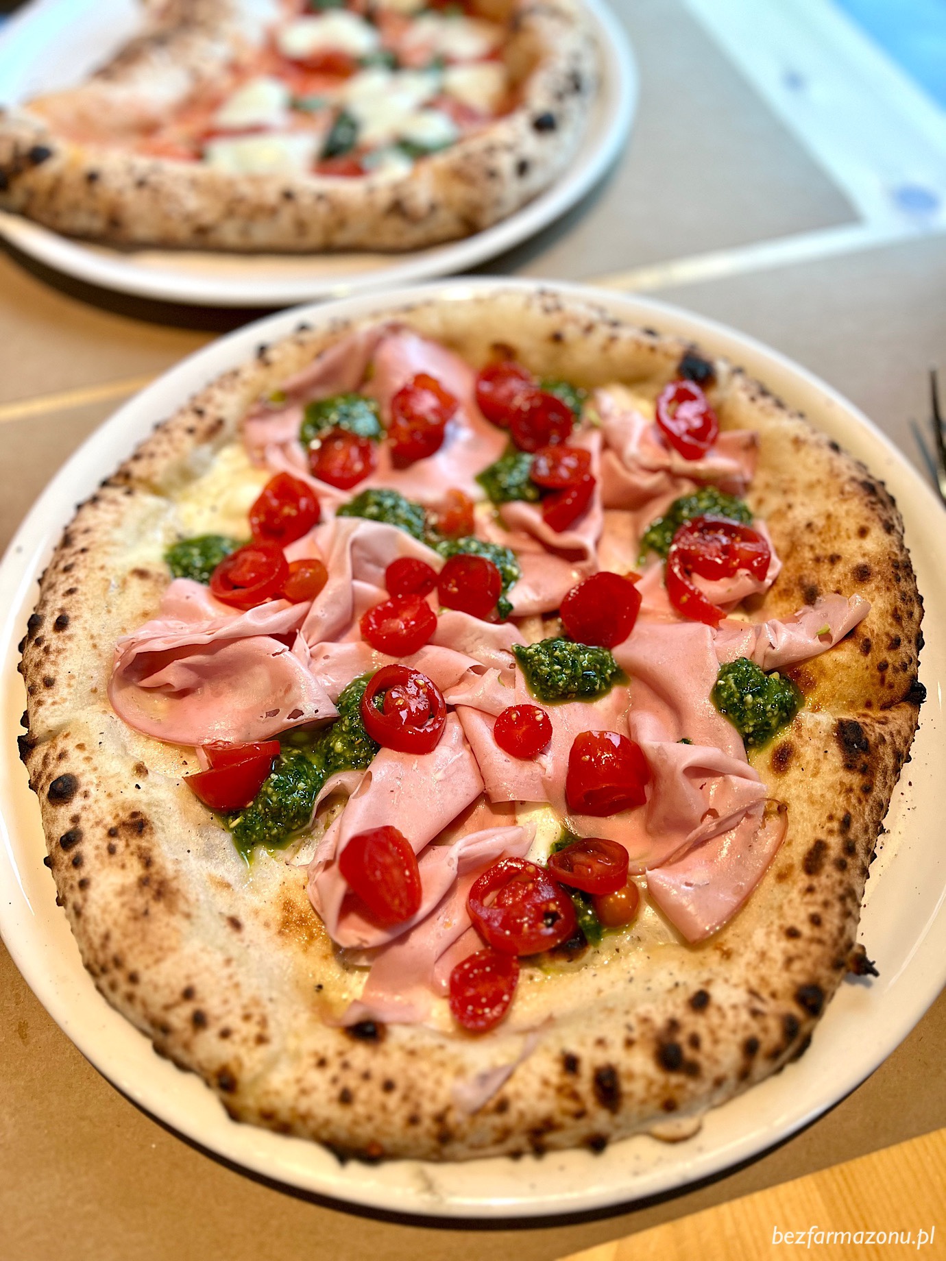 Białą Bella mortadela (43 PLN) z mozarellą buffalą, bazyliowym pesto, pomidorkami datterini, pieprzem i oliwą zachwyciła niesamowitą mortadelą bolońską igp. Trzy litery IGP świadczą o najwyższej jakości wędliny, jej pochodzeniu i składzie. I rzeczywiście, ta włoska szynka z resztą dodatków smakuje przewybornie – serio!